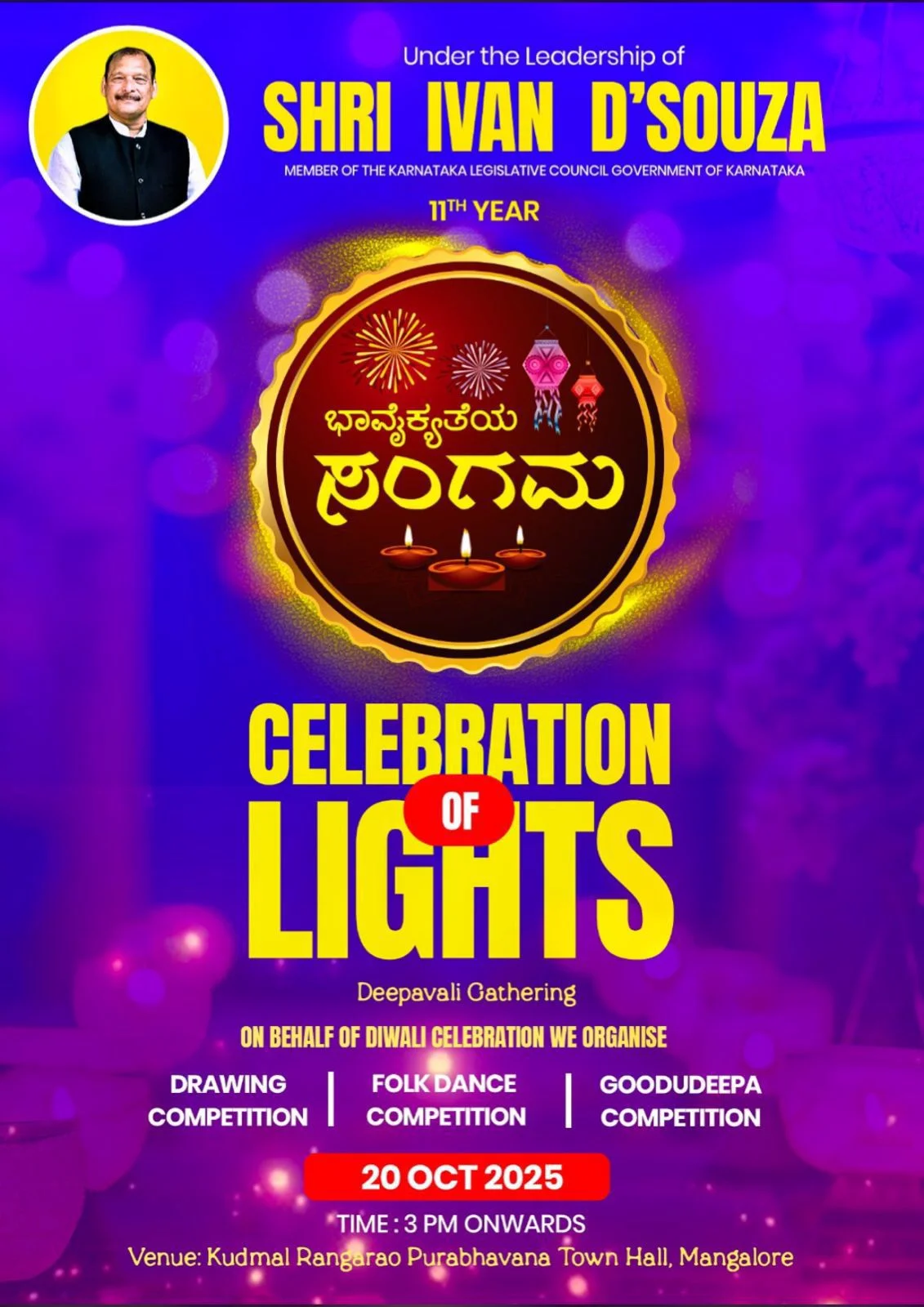 ಈ ಭಾರಿ 11ನೇ ವರ್ಷದ ಸಲುವಾಗಿ ಇದೇ ತಾ| 20-10—2025ರಂದು ಸೋಮವಾರ ನರಕಚತುರ್ದಶಿ ದಿನದಂದು ಮಂಗಳೂರಿನ ಕುದ್ಮುಲ್ ರಂಗರಾವ್ ಪುರಭವನದ ಸಭಾಭವನದಲ್ಲಿ ಸಂಜೆ ಗಂಟೆ 3:00ರಿಂದ ರಾತ್ರಿಯವರೆಗೆ ದೀಪಾವಳಿ ಹಬ್ಬದ ಅಚರಣೆಯ ಪ್ರಯುಕ್ತ, ಜಾನಪದ ನೃತ್ಯ ಸ್ಪರ್ಧೆ, ಚಿತ್ರಕಲಾ ಸ್ಪರ್ಧೆ ಹಾಗೂ ಗೂಡುದೀಪ ಸ್ಪರ್ಧೆಯನ್ನು ನಡೆಸಲಿದ್ದಾರೆ.