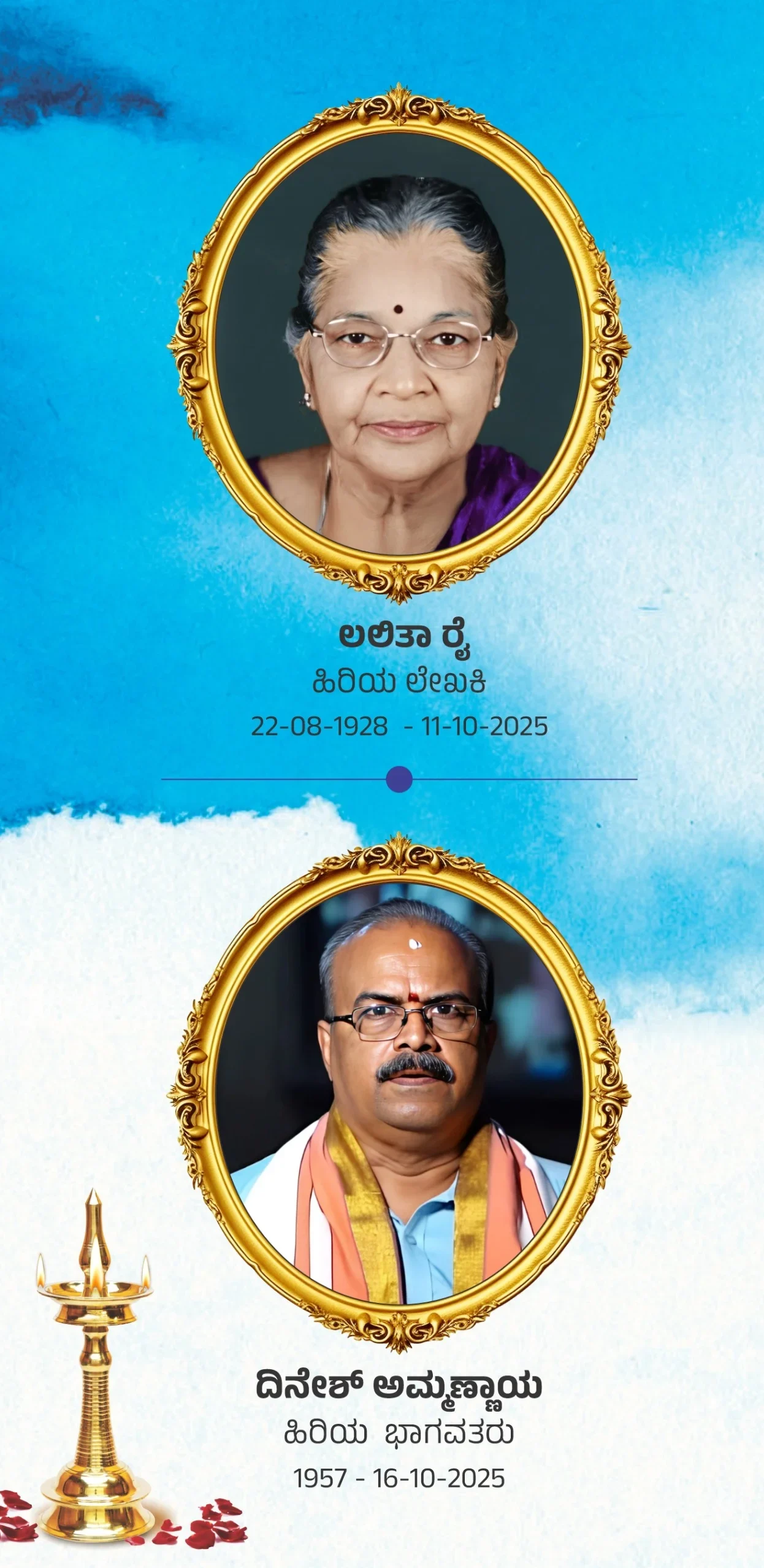 ಮಂಗಳೂರು : ಇತ್ತೀಚೆಗೆ ನಮ್ಮನ್ನಗಲಿದ ಸ್ವಾತಂತ್ರ್ಯ ಪೂರ್ವ ಕಾಲದ ಹಿರಿಯ ಲೇಖಕಿ ಲಲಿತಾ ರೈ ಹಾಗೂ ಹಿರಿಯ ಯಕ್ಷಗಾನ ಭಾಗವತರಾದ ದಿನೇಶ್ ಅಮ್ಮಣ್ಣಾಯ ಅವರಿಗೆ ಶೃದ್ಧಾಂಜಲಿ ಸಲ್ಲಿಸುವ ಹಾಗೂ ನುಡಿ ನಮನ ಅರ್ಪಿಸುವ ಸಭೆಯು ಅ.25 (ಶನಿವಾರ) ರಂದು ಸಂಜೆ 4.00 ಗಂಟೆಗೆ ಮಂಗಳೂರು ಉರ್ವಾಸ್ಟೋರ್ ನಲ್ಲಿರುವ ತುಳು ಅಕಾಡೆಮಿಯ ತುಳು ಭವನದಲ್ಲಿ ನಡೆಯಲಿದೆ.