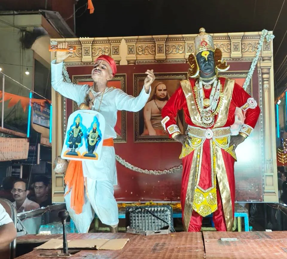 ಉಡುಪಿ ಕೋಟೇಶ್ವರದ ಶ್ರೀ ಪಟ್ಟಾಭಿರಾಮಚಂದ್ರ ದೇವಸ್ಥಾನದಲ್ಲಿ 100 ದಿನಗಳ ಅಖಂಡ ಭಜನಾ ಮಹೋತ್ಸವದ ಸಂದರ್ಭದಲ್ಲಿ ದಿನಾಂಕ 26-10-2025ರಂದು ಜರುಗಿದ ಶ್ರೀ ಕಾಶಿ ಮಠಾಧಿಪತಿ ಶ್ರಿ ಶ್ರೀ ಸಂಯಮೇಂದ್ರ ತೀರ್ಥ ಸ್ವಾಮೀಜಿಯವರ ವಿಶ್ವಾವಸು ನಾಮ ಸಂವತ್ಸರದ ಚಾತುರ್ಮಾಸ್ಯ ವ್ರತದ ಅಂಗವಾಗಿ ನಡೆಯುತ್ತಿರುವ ದಿಗ್ವಿಜಯ ಮಹೋತ್ಸವದ ಮೆರವಣಿಗೆಯಲ್ಲಿ ಕಾಣಿಸಿಕೊಂಡ ವಿಠಲ -ತುಕಾರಾಮರ ಆಕರ್ಷಕ ಟ್ಯಾಬ್ಲೋ ಭಕ್ತರ ಗಮನ ಸೆಳೆಯಿತು. ಸಂತ ತುಕಾರಾಮ ಪಾತ್ರಧಾರಿಯಾಗಿ ಎಂ.ಆರ್. ಪೈ ಅಂಬಾಗಿಲು ಹಾಗೂ ವಿಠಲನ ಪಾತ್ರಧಾರಿಯಾಗಿ ಶಿವಾನಂದ ಪ್ರಭು ಗುರುಪುರ ಮಂಗಳೂರು ಇವರು ಭಾಗವಹಿಸಿದ್ದರು. ಕಲಾವಿದರನ್ನು ಗೌರವಿಸಿ ಪ್ರಸಾದ ನೀಡಿ ಹರಿಸಿದರು.