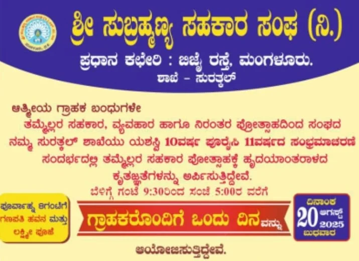 ಮಂಗಳೂರು ಸುಬ್ರಹ್ಮಣ್ಯ ಸಹಕಾರ ಸಂಘದ ಸುರತ್ಕಲ್ ಶಾಖೆಯ 11ನೇ ವರ್ಷದ ವಾರ್ಷಿಕ ದಿನಾಚರಣೆಯೊಂದಿಗೆ ಗ್ರಾಹಕರೊಂದಿಗೆ ಒಂದು ದಿನ ಕಾರ್ಯಕ್ರಮ ನಾಳೆ ಆಗಸ್ಟ್ 20 ರಂದು ನಡೆಯಲಿದೆ. ಹತ್ತು ವರ್ಷಗಳನ್ನು ಯಶಸ್ವಿಯಾಗಿ ಪೂರೈಸಿದ ಕಾರಣ ಬೆಳಗ್ಗೆ ಗಂಟೆ 8ಕ್ಕೆ ಗಣಪತಿ ಹವನ ಹಾಗೂ ಲಕ್ಷ್ಮಿ ಪೂಜೆ ನಡೆಯಲಿದೆ. ತರುವಾಯ ಅದೃಷ್ಟ ಗ್ರಾಹಕ ಎಂಬ ಕಾರ್ಯಕ್ರಮವನ್ನು ಹಮ್ಮಿಕೊಂಡಿದ್ದು ಆ ದಿನ ಬಂದವರಲ್ಲಿ ಮೂವರು ಅದೃಷ್ಟ ಗ್ರಾಹಕರಿಗೆ ಆಕರ್ಷಕ ಬಹುಮಾನವನ್ನು ನೀಡಲಾಗುವುದು ಎಂದು ಪ್ರಕಟಣೆ ತಿಳಿಸಿದೆ. ಆದುದರಿಂದ ಗ್ರಾಹಕರೆಲ್ಲರೂ ಆ ದಿನದಂದು ಹಾಜರಾಗಬೇಕೆಂದು ಸಂಘದ ಪದಾಧಿಕಾರಿಗಳು ಅಪೇಕ್ಷಿಸಿದ್ದಾರೆ.
