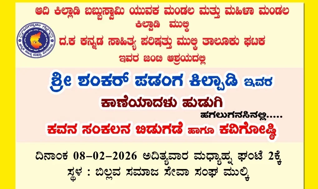 ಮೂಲ್ಕಿ : ಕರಾವಳಿಯ ಸಾಂಸ್ಕೃತಿಕ ಮಣ್ಣಿನಲ್ಲಿ ಮತ್ತೊಂದು ಸಾಹಿತ್ಯಿಕ ಮೈಲಿಗಲ್ಲು ಸ್ಥಾಪನೆಯಾಗುತ್ತಿದೆ. ತನ್ನ ವಿಭಿನ್ನ ಚಿಂತನೆ ಮತ್ತು ಹೊಸತನದ ಲೇಖನಿಯ ಮೂಲಕ ಭರವಸೆ ಮೂಡಿಸಿರುವ ಕವಿ ಶ್ರೀ ಶಂಕರ್ ಪಡಂಗ ಕಿಲ್ಪಾಡಿ ಅವರ ‘ಕಾಣೆಯಾದಳು ಹುಡುಗಿ’ ಎಂಬ ಕವನ ಸಂಕಲನವು ದಿನಾಂಕ 08-02-2026ರ ಭಾನುವಾರ ಮಧ್ಯಾಹ್ನ 2:00 ಗಂಟೆಗೆ ಮೂಲ್ಕಿಯ ಬಿಲ್ಲವ ಸಮಾಜ ಸೇವಾ ಸಂಘದಲ್ಲಿ ಬಿಡುಗಡೆಗೊಳ್ಳಲಿದೆ.