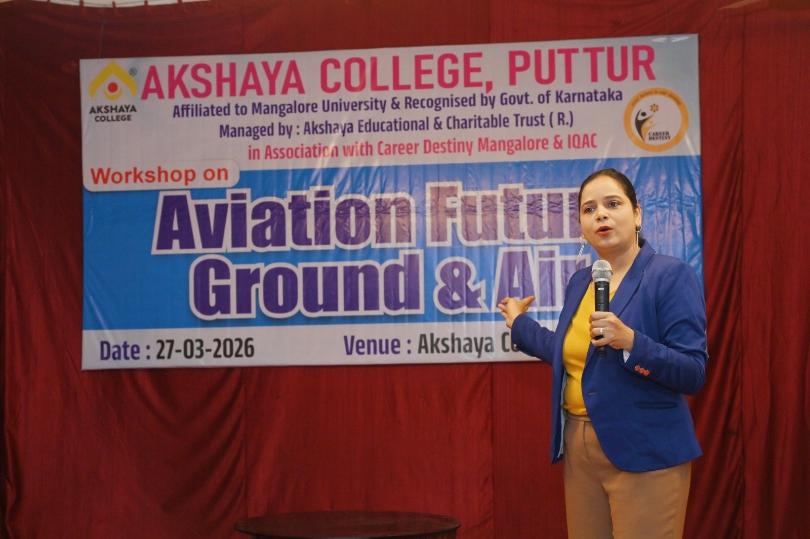 ವಿದ್ಯಾರ್ಥಿಗಳಿಗೆ ಉದ್ಯೋಗಮುಖಿ ತರಬೇತಿ ನೀಡುವಲ್ಲಿ ಈ ಸಂಸ್ಥೆ ಪ್ರಮುಖ ಪಾತ್ರವಹಿಸುತ್ತಿದೆ.ಅಕ್ಷಯ ಕಾಲೇಜು ಪುತ್ತೂರು ಇಲ್ಲಿನ ಏವಿಯೇಷನ್ ವಿಭಾಗದ ವತಿಯಿಂದ “AVIATION FUTURE GROUND AND AIR” ಎಂಬ ವಿಷಯದ ಕುರಿತು ಒಂದು ದಿನದ ಕಾರ್ಯಾಗಾರವನ್ನು ಹಮ್ಮಿಕೊಳ್ಳಲಾಯಿತು.