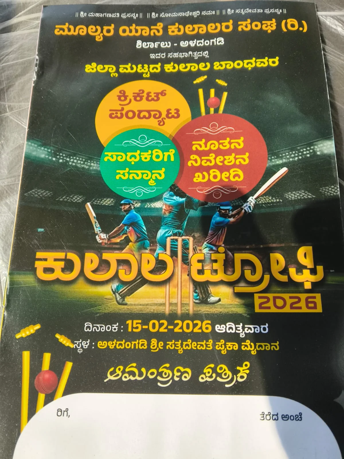 Uncategorizedಅಳದಂಗಡಿ : ಫೆ.15ರಂದು ಕುಲಾಲ ಟೋಫಿ 2026By TNVOffice - January 23, 2026031FacebookTwitterPinterestWhatsApp ಮೂಲ್ಯರ ಯಾನೆ ಕುಲಾಲರ ಸಂಘ (ರಿ.) ಶಿರ್ಲಾಲು – ಅಳದಂಗಡಿ ಇದರ ಸಹಭಾಗಿತ್ವದಲ್ಲಿ, ಜಿಲ್ಲಾ ಮಟ್ಟದ ಕುಲಾಲ ಬಾಂಧವರ ಕ್ರಿಕೆಟ್ ಪಂದ್ಯಾಟ, ಸಾಧಕರಿಗೆ ಸನ್ಮಾನ, ನೂತನ ನಿವೇಶನ ಕುಲಾಲ ಟ್ರೋಫಿ 2026 ಅಳದಂಗಡಿ ಶ್ರೀ ಸತ್ಯದೇವತೆ ಪೈಕಾ ಮೈದಾನದಲ್ಲಿ ದಿನಾಂಕ 15-02-2026 ಆದಿತ್ಯವಾರ ನಡೆಯಲಿದೆ.