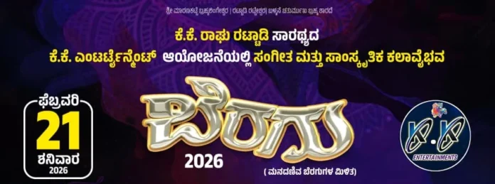 ಅಮಾಸೆಬೈಲು: ಕೆ.ಕೆ. ರಾಘು ರಟ್ಟಾಡಿ ಸಾರಥ್ಯದ ಕೆ.ಕೆ. ಎಂಟರ್ಟೈನ್ಸೆಂಟ್ ಆಯೋಜನೆಯಲ್ಲಿ ಸಂಗೀತ ಮತ್ತು ಸಾಂಸ್ಕೃತಿಕ ಕಲಾವೈಭವ ಬೆರಗು 2026 ಮನದಣಿವ ಬೆರಗುಗಳ ಮಿಳಿತ ಫೆಬ್ರವರಿ 21 ಶನಿವಾರ ನಡೆಯಲಿದೆ.