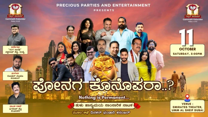ಅಕ್ಟೋಬರ್ ಹನ್ನೊಂದರಂದು ಸಂಜೆ ಐದು ಗಂಟೆಗೆ ನಗರದ ಎಮಿರೇಟ್ಸ್ ಥೀಯೇಟರ್ ಉಮ್ ಅಲ್ ಸೈಫ್ ನ ಸಭಾಂಗಣದಲ್ಲಿ “ಪೋನಗ ಕೊನೊಪರಾ..?” ಎಂಬ ತುಳು ನಾಟಕ ಪ್ರದರ್ಶನಗೊಳ್ಳಲಿದೆ.