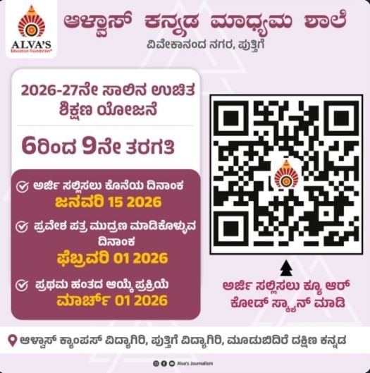 ಆಳ್ವಾಸ್ ಶಿಕ್ಷಣ ಪ್ರತಿಷ್ಠಾನದ ವತಿಯಿಂದ 26- 27ನೇ ಶೈಕ್ಷಣಿಕ ಸಾಲಿನ ಉಚಿತ ಶಿಕ್ಷಣ ಯೋಜನೆಗೆ ಅರ್ಜಿಗಳನ್ನು ಆಹ್ವಾನಿಸಲಾಗಿದೆ. ಆರನೇ ತರಗತಿಯಿಂದ 9ನೇ ತರಗತಿಯ ತನಕ ಕನ್ನಡ ಮಾಧ್ಯಮದ ಉಚಿತ ಶಿಕ್ಷಣವು ಆಳ್ವಾಸ್ ಶಿಕ್ಷಣ ಸಂಸ್ಥೆಯಲ್ಲಿ ದೊರಕಲಿದ್ದು ಆಸಕ್ತ ವಿದ್ಯಾರ್ಥಿಗಳು ಜನವರಿ 15ಕ್ಕೆ ಮೊದಲು ಆನ್ಲೈನ್ ನಲ್ಲಿ ಅರ್ಜಿಯನ್ನು ಸಲ್ಲಿಸತಕ್ಕದ್ದು. ಬಂದ ಅರ್ಜಿಗಳಿಗೆ ಪ್ರವೇಶ ಪತ್ರಗಳನ್ನು ಆನ್ಲೈನ್ ನಲ್ಲಿಯೇ ಫೆಬ್ರವರಿ ಒಂದರ ಒಳಗೆ ಮುದ್ರಣ ಮಾಡಿಕೊಳ್ಳತಕ್ಕದ್ದು. ಪ್ರವೇಶಪತ್ರದಲ್ಲಿ ಮುಂದಿನ ಹಂತದ ವಿವರಗಳು ಲಭ್ಯವಿದ್ದು , ಮಾರ್ಚ್ 1ನೇ ತಾರೀಖಿನಂದು ಪ್ರಥಮ ಹಂತದ ಆಯ್ಕೆ ಪ್ರಕ್ರಿಯೆ ಮುಗಿಯಲಿದೆ. ಆಯ್ಕೆಗೊಂಡವರಿಗೆ ಸಂಪೂರ್ಣ ಉಚಿತ ಶಿಕ್ಷಣ ದೊರಕಲಿದೆ. ಆಸಕ್ತರು ಇಲ್ಲಿ ನೀಡಿರುವ ಸ್ಕ್ಯಾನರ್ ಅಥವಾ ಲಿಂಕ್ ಮೂಲಕ ಅರ್ಜಿ ಸಲ್ಲಿಸಲು ಕೊನೆಯ ದಿನಾಂಕ ಜನವರಿ 15 ಆಗಿರುತ್ತದೆ ಎಂದು ಪ್ರಕಟಣೆ ತಿಳಿಸಿದೆ.