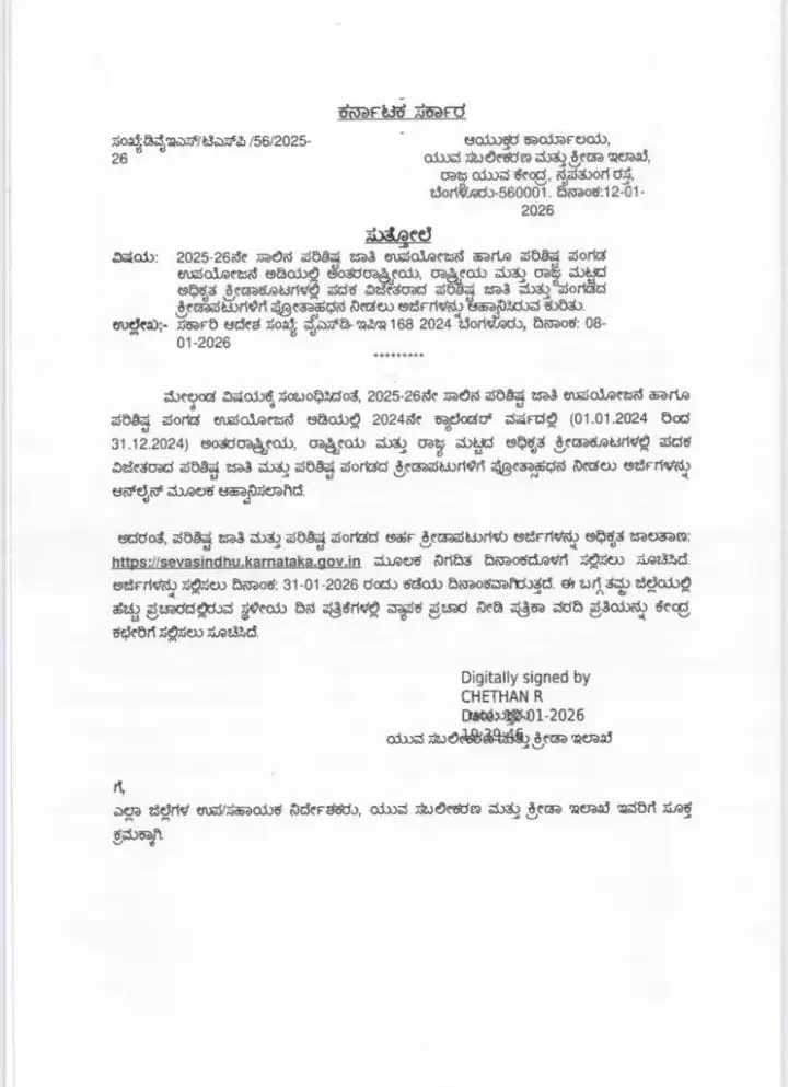 ಪರಿಶಿಷ್ಟ ಜಾತಿ ಮತ್ತು ಪರಿಶಿಷ್ಟ ಪಂಗಡದ ಅರ್ಹ ಕ್ರೀಡಾಪಟುಗಳು ಅರ್ಜಿಗಳನ್ನು ಅಧಿಕೃತ ಜಾಲತಾಣ: https://sevasindhu.karnataka.gov.in ໖. ಅರ್ಜಿಗಳನ್ನು ಸಲ್ಲಿಸಲು ದಿನಾಂಕ: 31-01-2026 ರಂದು ಕಡೆಯ ದಿನಾಂಕವಾಗಿರುತ್ತದೆ. ಈ ಬಗ್ಗೆ ತಮ್ಮ ಜಿಲ್ಲೆಯಲ್ಲಿ ಹೆಚ್ಚು ಪ್ರಚಾರದಲ್ಲಿರುವ ಸ್ಥಳೀಯ ದಿನ ಪತ್ರಿಕೆಗಳಲ್ಲಿ ವ್ಯಾಪಕ ಪ್ರಚಾರ ನೀಡಿ ಪತ್ರಿಕಾ ವರದಿ ಪ್ರತಿಯನ್ನು ಕೇಂದ್ರ ಕಛೇರಿಗೆ ಸಲ್ಲಿಸಲು ಸೂಚಿಸಿದೆ.