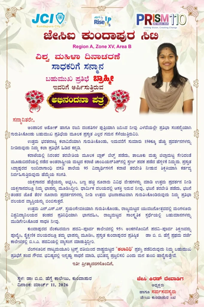 ಜೆ.ಸಿ.ಐ ಕುಂದಾಪುರ ಸಿಟಿ ಇವರ ವತಿಯಿಂದ ನಡೆದ ವಿಶ್ವ ಮಹಿಳಾ ದಿನಾಚರಣೆಯ ಅಂಗವಾಗಿ ವಿವಿಧ ಕ್ಷೇತ್ರದಿಂದ ಸಾಧನೆ ಮಾಡಿದ ಸಾಧಕ ಸ್ತ್ರೀ ಪುರಸ್ಕಾರ ಕುಮಾರಿ ಬ್ರಾಹ್ಮೀ ಬಳ್ಕೂರು ಪಡೆದಿರುತ್ತಾರೆ.