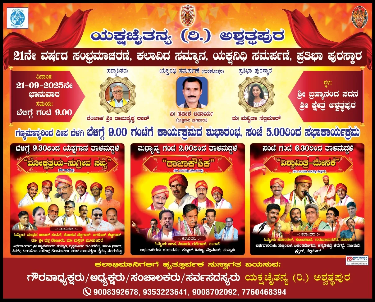 ಮೂಡುಬಿದಿರೆ: ತಾಲೂಕಿನ ಅಶ್ವತ್ಥಪುರ ಗ್ರಾಮದ ಯಕ್ಷ ಚೈತನ್ಯ ಬಳಗದ 21ನೇ ವರ್ಷದ ಸಂಭ್ರಮಾಚರಣೆ ಸೆ. 21ರಂದು ಅಶ್ವತ್ಥ್ ಪುರದ ಬ್ರಹ್ಮಾನಂದ ಸದನದಲ್ಲಿ ನಡೆಯಲಿದೆ.