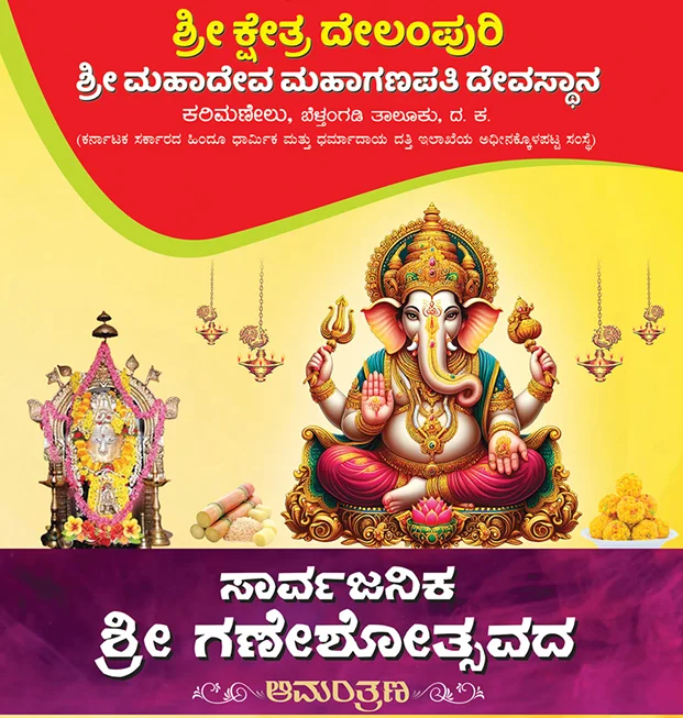 ವೇಣೂರು: ಕರಿಮಣೇಲು ಗ್ರಾಮದ ಶ್ರೀ ಕ್ಷೇತ್ರ ದೇಲಂಪುರಿ ಶ್ರೀ ಮಹಾದೇವ ಮಹಾಗಣಪತಿ ದೇವಸ್ಥಾನದಲ್ಲಿ ಆ. 27ರಿಂದ 29ರವರೆಗೆ ಸಾರ್ವಜನಿಕ ಶ್ರೀ ಗಣೇಶೋತ್ಸವವು ವೈಭವದಿಂದ ಜರಗಲಿದೆ.