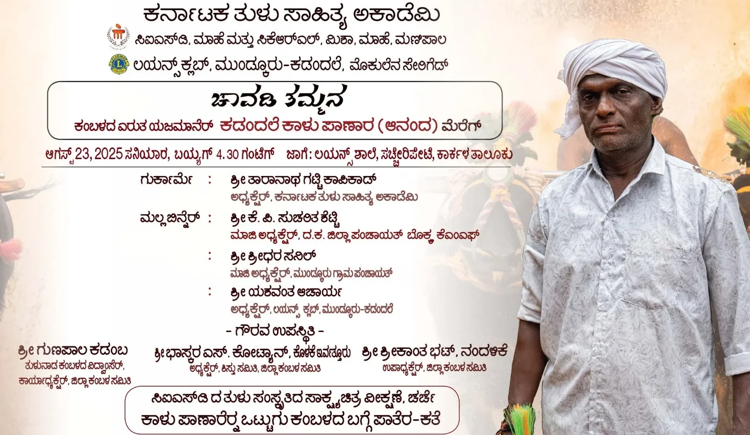 ಮಂಗಳೂರು : ಕಂಬಳ ಕೋಣಗಳ ಯಜಮಾನ ಹಾಗೂ ದೈವಾರಾಧಕ ಕಡಂದಲೆ ಕಾಳು ಪಾಣಾರ ಅವರಿಗೆ ಕರ್ನಾಟಕ ತುಳು ಸಾಹಿತ್ಯ ಅಕಾಡೆಮಿಯ ಚಾವಡಿ ತಮ್ಮನದ ಗೌರವ ಸಮರ್ಪಣೆಯ ಕಾರ್ಯಕ್ರಮ ಆಗಸ್ಟ್ 23ರಂದು ಸಂಜೆ 4.30 ಗಂಟೆಗೆ ಕಾರ್ಕಳ ತಾಲೂಕಿನ ಸಚ್ಚರಿಪೇಟೆಯ ಲಯನ್ಸ್ ಶಾಲೆಯಲ್ಲಿ ನಡೆಯಲಿದೆ.