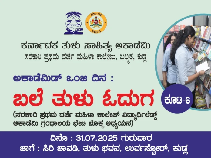 ಮಂಗಳೂರು : ನಗರದ ಬಲ್ಮಠ ಸರಕಾರಿ  ಮಹಿಳಾ ಕಾಲೇಜಿನ ವಿದ್ಯಾರ್ಥಿಗಳು ಜುಲೈ 31ರಂದು ಕರ್ನಾಟಕ ತುಳು ಸಾಹಿತ್ಯ ಅಕಾಡೆಮಿಯ ‘ಅಕಾಡೆಮಿಡ್ ಒಂಜಿ ದಿನ ; ಬಲೆ ತುಳು ಓದುಗ’ ಕಾರ್ಯಕ್ರಮದಲ್ಲಿ ಭಾಗವಹಿಸುವರು.  ‘ಅಕಾಡೆಮಿಡ್  ಒಂಜಿ ದಿನ; ಬಲೆ ತುಳು ಓದಗ’ ಅಭಿಯಾನದ ಆರನೇ ಕಾರ್ಯಕ್ರಮದ ಉದ್ಘಾಟನೆ ಜು.31 ರಂದು ಬೆಳಿಗ್ಗೆ 10:00 ಗಂಟೆಗೆ ನಡೆಯಲಿದೆ.