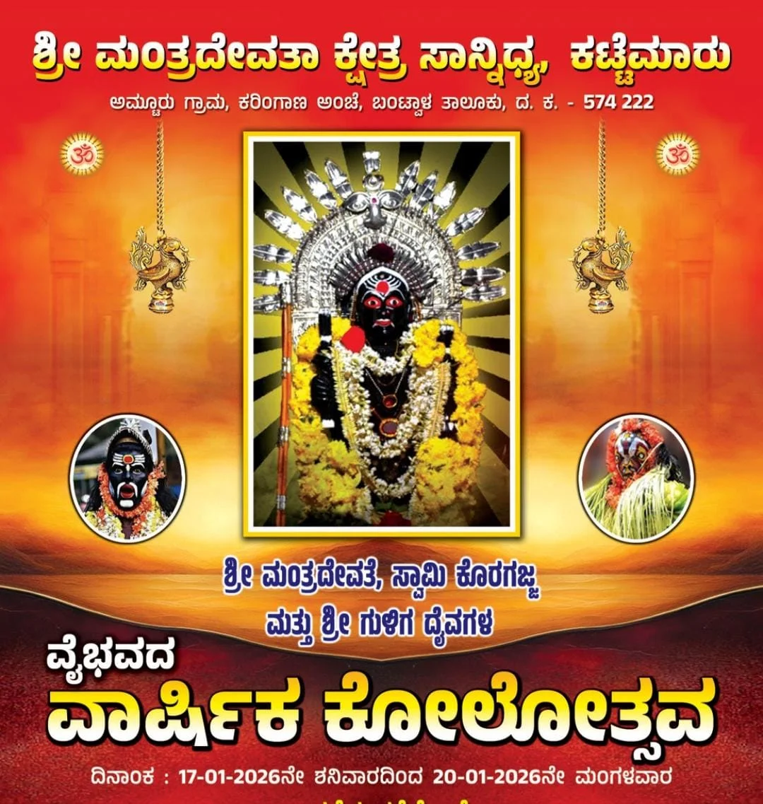 ಬಂಟ್ವಾಳ ತಾಲೂಕಿನ ಅಮ್ಟೂರು ಗ್ರಾಮದ ಶ್ರೀ ಮಂತ್ರ ದೇವತಾ ಕ್ಷೇತ್ರ ಸಾನಿಧ್ಯ ಕಟ್ಟೆಮಾರ್ ನಲ್ಲಿ ಶ್ರೀಮಂತ್ರ ದೇವತೆ, ಸ್ವಾಮಿ ಕೊರಗಜ್ಜ, ಮತ್ತು ಶ್ರೀ ಗುಳಿಗ ದೈವಗಳ ವೈಭವದ ವಾರ್ಷಿಕ ಕೋಲೊತ್ಸವ ದಿನಾಂಕ 17 -01=2026 ಶನಿವಾರ ದಿಂದ 20-1-2026 ಮಂಗಳವಾರ ತನಕ ನಡೆಯಲಿರುವುದು.