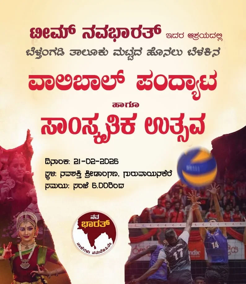 ಬೆಳ್ತಂಗಡಿ :ನಾಳೆ (ಫೆ.21)ಟೀಮ್ ನವಭಾರತ್ ಇದರ ಆಶ್ರಯದಲ್ಲಿ ಬೆಳ್ತಂಗಡಿ ತಾಲೂಕು ಮಟ್ಟದ ಹೊನಲು ಬೆಳಕಿನ ವಾಲಿಬಾಲ್ ಪಂದ್ಯಾಟ ಹಾಗೂ ಸಾಂಸ್ಕೃತಿಕ ಉತ್ಸವ. ಸಂಜೆ 6.00 ರಿಂದ, ಗುರುವಾಯನಕೆರೆ ನವಶಕ್ತಿ ಕ್ರೀಡಾಂಗಣದಲ್ಲಿ ಹಲವಾರು ಗಣ್ಯ ಅತಿಥಿಗಳ ಉಪಸ್ಥಿತಿಯಲ್ಲಿ ನೆರವೇರಲಿದೆ.ಟೀಮ್ ನವಭಾರತ್, ಕಳೆದ ಒಂದೆರಡು ವರ್ಷಗಳ ಹಿಂದೆ ರಾಷ್ಟ್ರೀಯ ಚಿಂತನೆಯನ್ನು ಒಳಗೊಂಡ ಸಮಾನ ಮನಸ್ಕ ಯುವಕರು ಪ್ರಾರಂಭಿಸಿದ ಸಾಮಾಜಿಕ ಜಾಲತಾಣದ ಸಕ್ರಿಯ ತಂಡ, ಆದರೆ ಕಳೆದ ಒಂದು ವರ್ಷ ಹಿಂದೆ ನಡೆದ ಕಹಿ ಘಟನೆ ನಮ್ಮ ಆಲೋಚನೆಗಳನ್ನೇ ಬದಲಾಯಿಸಿತು, ರಸ್ತೆ ಅಪಘಾತಕ್ಕೆ ಸಿಲುಕಿ ನಮ್ಮ ತಂಡದ ಸದಸ್ಯನ ಮರಣ ಈ ತಂಡಕ್ಕೆ ಅಪಾರ ನೋವುಂಟು ಮಾಡಿತ್ತು, ಆದರೆ ಆತನ ಹೆಸರಿನಲ್ಲಿ ಮತ್ತಷ್ಟು ಸಾಮಾಜಿಕ ಚಟುವಟಿಕೆಯನ್ನು ಮುಂದುವರಿಸಬೇಕು ಎಂದು ಪಣತೊಟ್ಟ ನಾವುಗಳು ಕಳೆದ ಬಾರಿ ರಕ್ತದಾನ ಶಿಬಿರ ಹಾಗೂ ಕ್ರೀಡಾ ಚಟುವಟಿಕೆಯನ್ನು ನಡೆಸಿ ಅದರಲ್ಲಿ ಉಳಿದ ಸುಮಾರು ಒಂದು ಲಕ್ಷಕ್ಕೂ ಅಧಿಕ ಮೊತ್ತವನ್ನು ತಾಲೂಕಿನ ಐದು ಬಡ ಪ್ರತಿಭಾನ್ವಿತಾ ವಿದ್ಯಾರ್ಥಿಗಳ ಕಾಲೇಜು ಶುಲ್ಕವನ್ನು ಭರಿಸಿರುತ್ತೇವೆ, ಈ ಬಾರಿಯೂ ಮತ್ತಷ್ಟು ನವ ಯೋಚನೆಗಳ ಜೊತೆಗೆ ಈ ಕಾರ್ಯಕ್ರಮವನ್ನು ಆಯೋಜಿಸಿರುತ್ತೇವೆ.