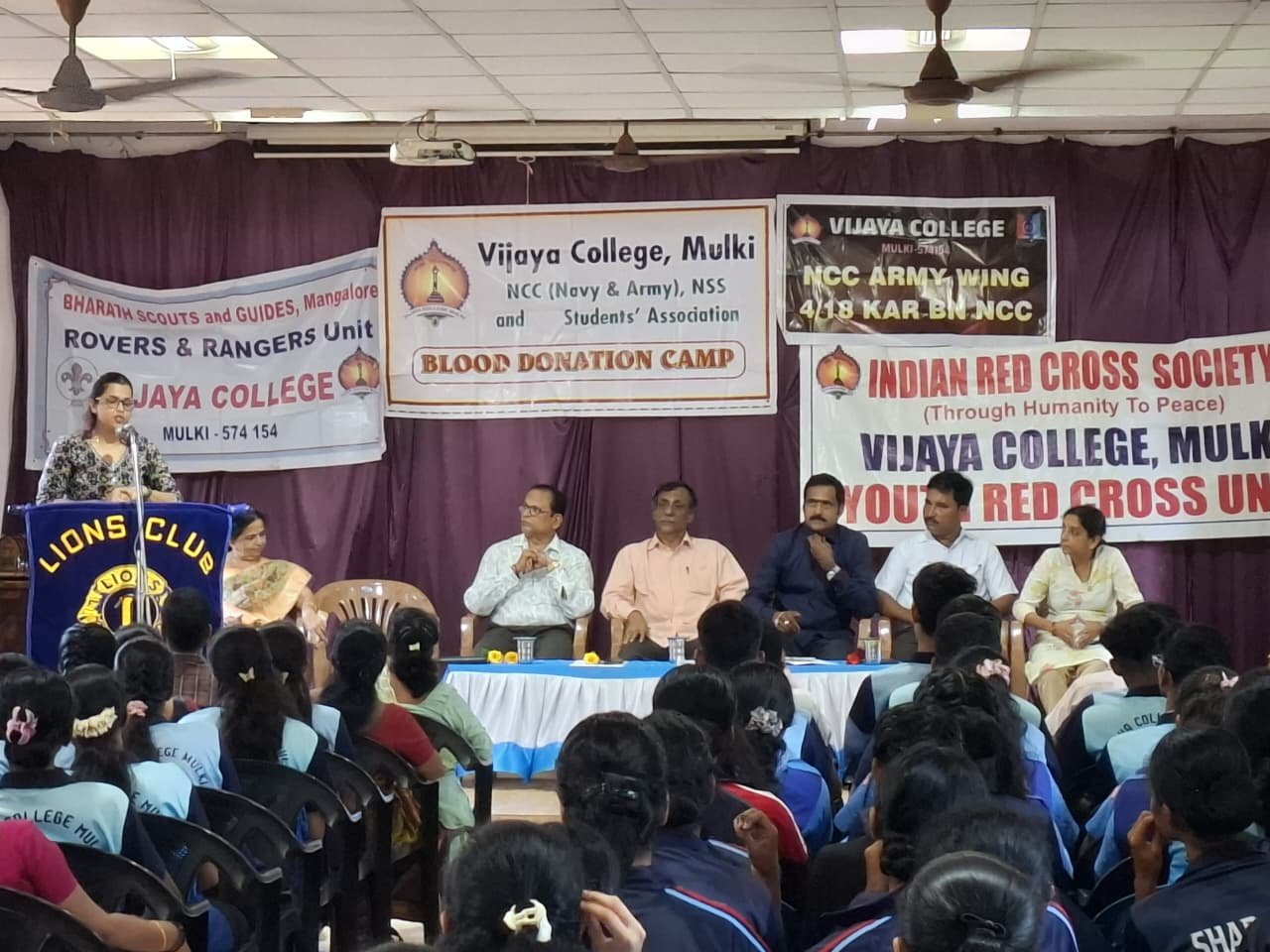 ದಿನಾಂಕ 8.10.2025 ರಂದು ವಿಜಯ ಕಾಲೇಜು, ಮುಲ್ಕಿ, ರಾಷ್ಟ್ರೀಯ ಸೇವಾ ಯೋಜನೆ ಘಟಕ, ರೆಡ್ ಕ್ರಾಸ್ ರೋವರ್ಸ್ ರೆಂಜರ್ಸ್, ಎನ್ ಸಿ ಸಿ ಇದರ ಆಶ್ರಯದಲ್ಲಿ ಹಾಗೂ ಲಯನ್ಸ್ ಕ್ಲಬ್ ಬಪ್ಪನಾಡು ಇನ್ಸ್ಪಾಯರ್ ಮತ್ತು ಕೆಎಂಸಿ ಆಸ್ಪತ್ರೆ ಅತ್ತಾವರ ಇವರ ಸಹಕಾರದೊಂದಿಗೆ ರಕ್ತದಾನ ಶಿಬಿರವನ್ನು ವಿಜಯ ಕಾಲೇಜು, ಮೂಲ್ಕಿಯಲ್ಲಿ ಹಮ್ಮಿಕೊಳ್ಳಲಾಯಿತು . ಈ ಕಾರ್ಯಕ್ರಮದ ಅಧ್ಯಕ್ಷತೆಯನ್ನು ವಹಿಸಿ ಮಾತನಾಡಿದ ಪ್ರೊ. ವೆಂಕಟೇಶ ಭಟ್, ವಿದ್ಯಾರ್ಥಿಗಳಿಗೆ ರಕ್ತದಾನದ ಬಗ್ಗೆ ಮಾಹಿತಿಯನ್ನು ನೀಡಿದರು.