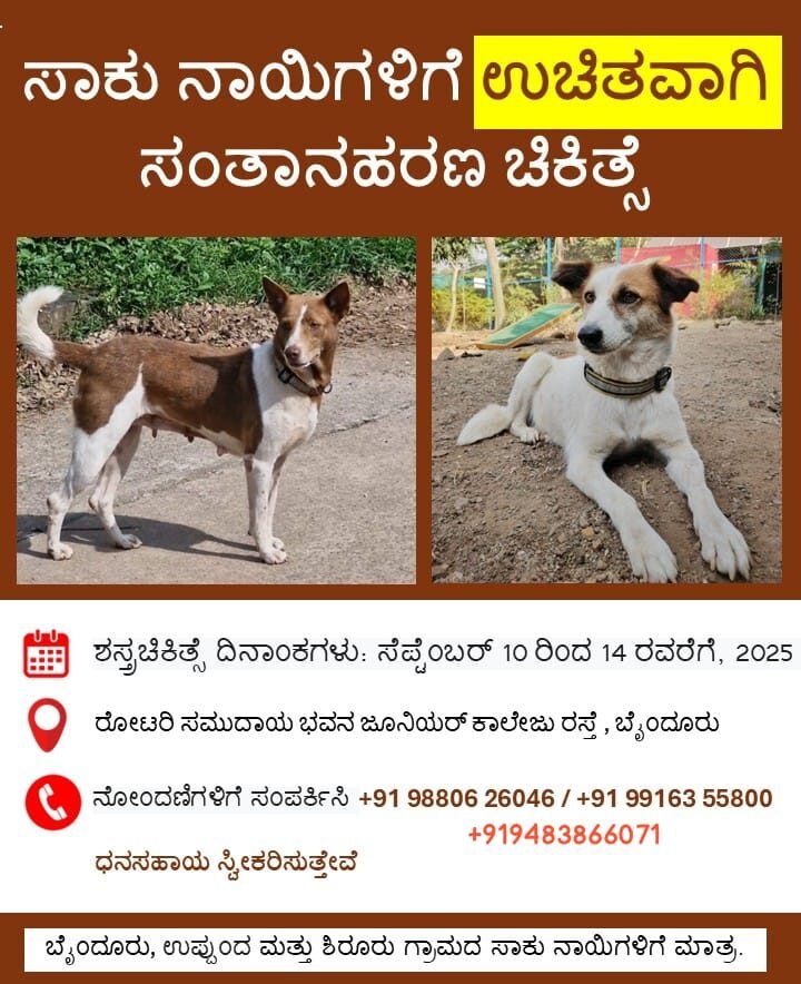 ಬೈಂದೂರಿನಲ್ಲಿ ಇಂದಿನಿಂದ ನಾಯಿಗಳಿಗೆ ಉಚಿತ ಸಂತಾನಹರಣ ಚಿಕಿತ್ಸೆ ರೋಟರಿ ಸಮುದಾಯ ಭವನ ಬೈಂದೂರು ಇಲ್ಲಿ ಸೆಪ್ಟೆಂಬರ್ 10 ರಿಂದ 14ನೇ ತಾರೀಖಿನವರೆಗೆ ಐದು ದಿನಗಳ ಕಾಲ ಭಾರತೀಯ ತಳಿಯ ಸಾಕು ನಾಯಿಗಳಿಗೆ ಉಚಿತ ಸಂತಾನ ಹರಣ ಚಿಕಿತ್ಸೆ ಹಾಗೂ ಉಚಿತ ಲಸಿಕೆ ಕಾರ್ಯಕ್ರಮ ನಡೆಯಲಿದೆ.