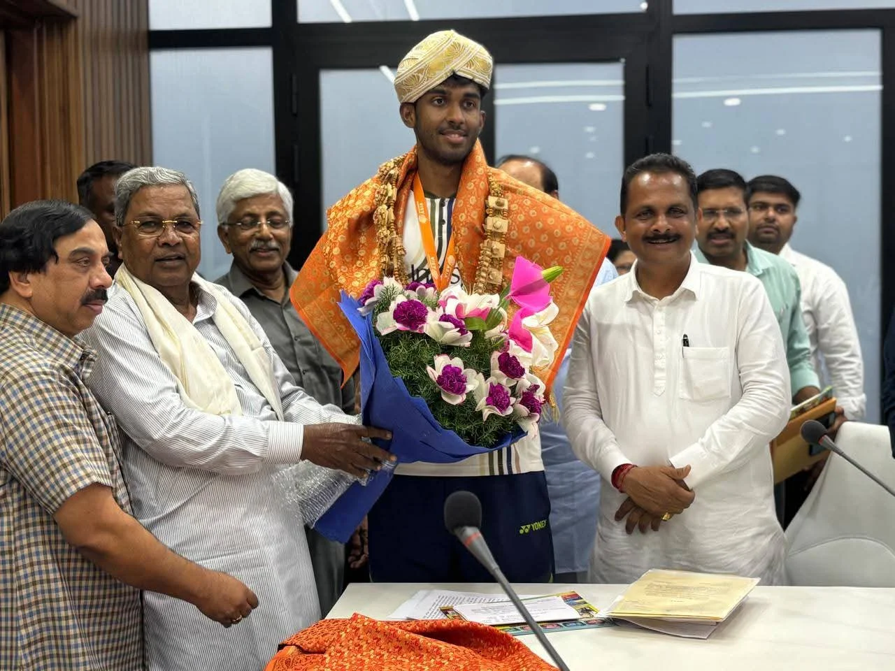 ಬ್ಯಾಡ್ಮಿಂಟನ್ ಏಷ್ಯಾ ಚಾಂಪಿಯನ್ ಶಿಪ್ ನಲ್ಲಿ ಬೆಳ್ಳಿ ಗೆದ್ದ ಮೊದಲ ಭಾರತೀಯ ಕಾರ್ಕಳದ ಆಯುಷ್ ಶೆಟ್ಟಿ ಯವರನ್ನು ರಾಜ್ಯದ ಮುಖ್ಯಮಂತ್ರಿ ಸನ್ಮಾನ್ಯ ಸಿದ್ದರಾಮಯ್ಯನವರು ವಿಧಾನಸೌಧದ ಕಚೇರಿಯಲ್ಲಿ ಅಭಿನಂದಿಸಿ ಶಾಲು ಹಾಕಿ ಗೌರವಿಸಿದರು.