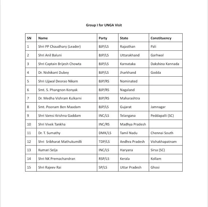 ಭಾರತದಿಂದ ವಿವಿಧ ಪಕ್ಷಗಳ ಸಂಸದರನ್ನು ಒಳಗೊಂಡಿರುವ ಎರಡು ನಿಯೋಗವು ವಿಶ್ವಸಂಸ್ಥೆಯ ಸಾಮಾನ್ಯ ಸಭೆಯ ಈ ಅಧಿವೇಶನದಲ್ಲಿ ಭಾಗವಹಿಸಲಿದೆ. ಆ ಪೈಕಿ ಪಿಪಿ ಚೌಧರಿ ನೇತೃತ್ವದ ಮೊದಲ ನಿಯೋಗವು ಅ.8ರಿಂದ 14ರವರೆಗೆ ನಡೆಯುವ ಅಧಿವೇಶನದಲ್ಲಿ ಪಾಲ್ಗೊಳ್ಳಲಿದ್ದು, ಈ ತಂಡದಲ್ಲಿ ಕರ್ನಾಟಕದಿಂದ ಸಂಸದ ಕ್ಯಾ. ಬ್ರಿಜೇಶ್‌ ಚೌಟ ಅವರು ಸ್ಥಾನ ಪಡೆದಿದ್ದಾರೆ. ಇವರೊಂದಿಗೆ ಸಂಸದರಾಗಿರುವ ಅನಿಲ್ ಬಲೂನಿ, ಡಾ. ನಿಶಿಕಾಂತ್ ದುಬೆ, ಉಜ್ವಲ್ ನಿಕಮ್, ಎಸ್ ಫಾಂಗ್ನಾನ್ ಕೊನ್ಯಾಕ್, ಡಾ. ಮೇಧಾ ವಿಶ್ರಮ್ ಕುಲಕರ್ಣಿ, ಪೂನಂ ಬೆನ್ ಮಾದಮ್, ವಂಶಿ ಕೃಷ್ಣ ಗದ್ದಾಮ್, ವಿವೇಕ್ ತಂಖಾ, ಡಾ. ಟಿ ಸುಮತಿ, ಎನ್.ಕೆ. ಪ್ರೇಮಚಂದ್ರನ್, ಕುಮಾರಿ ಸೆಲ್ಜಾ, ಮಾತುಕುಮಿಲ್ಲಿ ಶ್ರೀಭರತ್ ಮತ್ತು ರಾಜೀವ್ ರೈ ಅವರು ನಿಯೋಗದಲ್ಲಿ ನ್ಯೂಯಾರ್ಕ್‌ಗೆ ತೆರಳಿದ್ದಾರೆ.