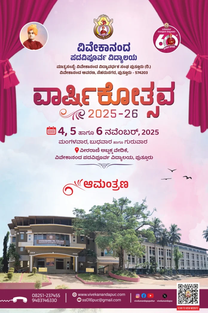 ವಿವೇಕಾನಂದ ವಿದ್ಯಾವರ್ಧಕ ಸಂಘದ ಮೊದಲ ಸಂಸ್ಥೆ ವಿವೇಕಾನಂದ ಪದವಿಪೂರ್ವಕಾಲೇಜು 60 ಸಂವತ್ಸರಗಳನ್ನು ಪೂರೈಸುತ್ತಿದ್ದು ಈ ಸಂಭ್ರಮಾಚರಣೆಯ ಸಂದರ್ಭದಲ್ಲಿವಿವೇಕಾನAದ ಪದವಿಪೂರ್ವಕಾಲೇಜಿನಲ್ಲಿ ನವಂಬರ್4,5,6 ನೇ ತಾರೀಕು ಮಂಗಳವಾರ, ಬುಧವಾರ ಮತ್ತು ಗುರುವಾರದಂದು ಪ್ರಸಕ್ತ ಶೈಕ್ಷಣಿಕ ವರ್ಷದ ಕಾಲೇಜು ವಾರ್ಷಿಕೋತ್ಸವವು ನಡೆಯಲಿದೆ.