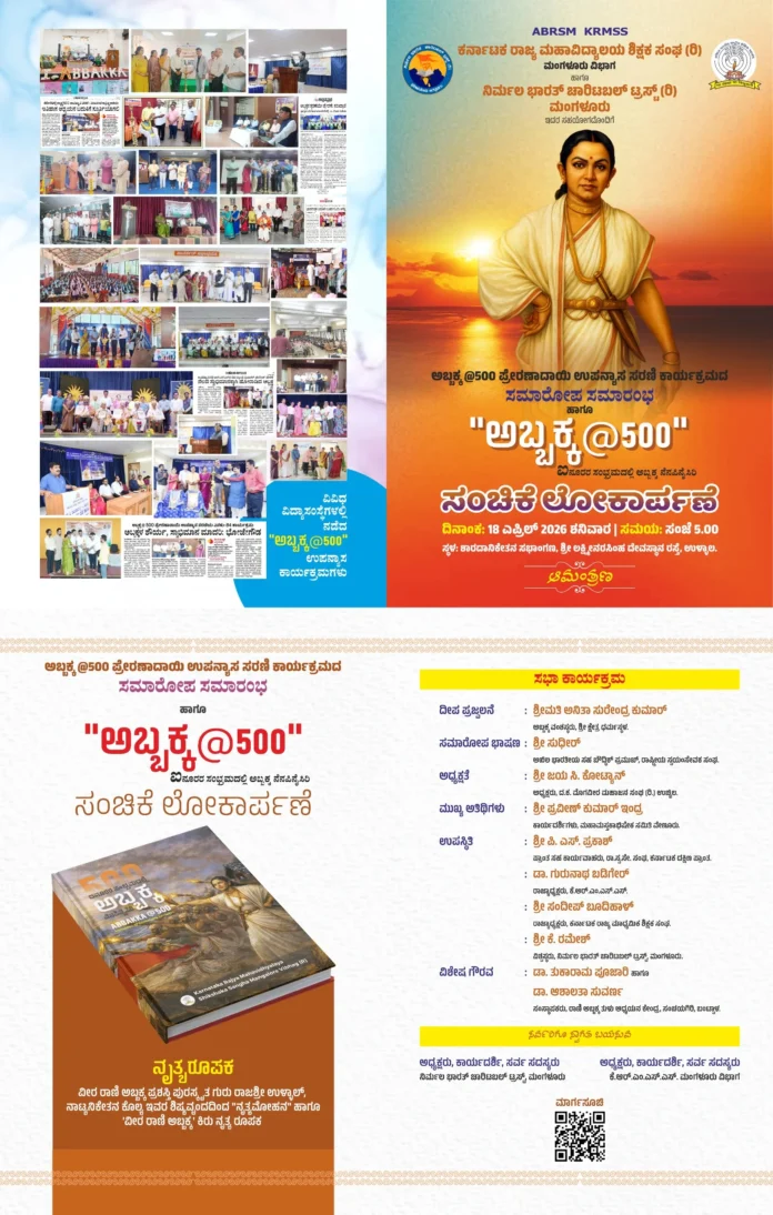 ಮಂಗಳೂರು:ಉಳ್ಳಾಲದ ಅಬ್ಬಕ್ಕ ರಾಣಿ ಆಳ್ವಿಕೆಯ 500ನೇ ವರ್ಷಾಚರಣೆಯ ಪ್ರಯುಕ್ತ ಕರ್ನಾಟಕ ರಾಜ್ಯ ಮಹಾವಿದ್ಯಾಲಯಗಳ ಉಪನ್ಯಾಸಕರ ಹಾಗೂ ಶಿಕ್ಷಕರ ಸಂಘ (ರಿ)ಮಂಗಳೂರು ವಿಭಾಗದ ವತಿಯಿಂದ ಹಮ್ಮಿಕೊಳ್ಳಲಾಗಿದ್ದ ಅಬ್ಬಕ್ಕ ರಾಣಿಯ ಕುರಿತ 100 ಸರಣಿ ಉಪನ್ಯಾಸ ಕಾರ್ಯಕ್ರಮಗಳ ಸಮಾರೋಪ ಸಮಾರಂಭ ಹಾಗೂ ನಾಡಿನ ಹಲವು ಖ್ಯಾತ ಉಪನ್ಯಾಸಕರು, ಸಾಹಿತಿಗಳು,ಸಂಶೋಧಕರು ಅಬ್ಬಕ್ಕ ರಾಣಿಯ ಕುರಿತಾಗಿ ಸಂಶೋಧನೆ ನಡೆಸಿ ಸಿದ್ಧಪಡಿಸಿದ ಸಂಶೋಧನಾತ್ಮಕ ಪ್ರಬಂಧಗಳನ್ನೊಳಗೊಂಡ ವಿಶೇಷ ಬೃಹತ್ ಗ್ರಂಥ ಸಂಚಿಕೆಯ ಲೋಕಾರ್ಪಣಾ ಕಾರ್ಯಕ್ರಮವು ಮಂಗಳೂರಿನ ನಿರ್ಮಲ ಭಾರತ್ ಚಾರಿಟೇಬಲ್ ಟ್ರಸ್ಟ್ (ರಿ )ಇದರ ಸಹಯೋಗದೊಂದಿಗೆ ಕಳೆದ ದಿನಾಂಕ 18 4 2026ನೇ ಶನಿವಾರ ಉಳ್ಳಾಲದ ಶಾರದಾ ನಿಕೇತನ ಸಭಾಂಗಣದಲ್ಲಿ ನಡೆಯಿತು.