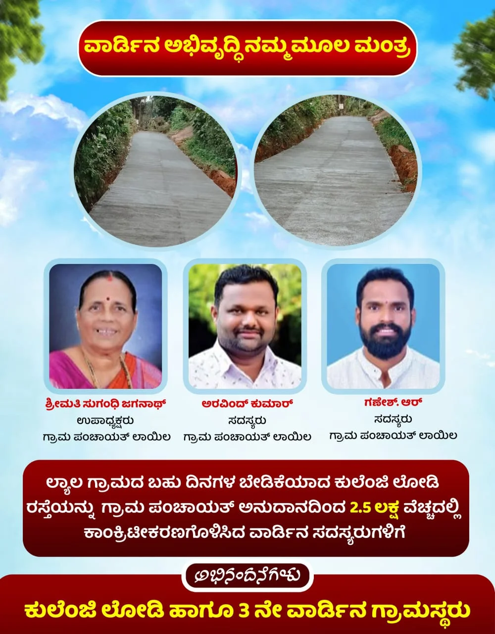 ಲಾಯಿಲ ಗ್ರಾಮದ ಬಹುಬೇಡಿಕೆಯ ವಿಮುಕ್ತಿ ವಿಶೇಷ ಶಾಲೆ ಹಾಗೂ ಪಿಲಿ ಪಂಜರ ದೈವಸ್ಥಾನ ಸಂಪರ್ಕಿಸುವ ರಸ್ತೆಯು ಲಾಯಿಲ ಗ್ರಾಮ ಪಂಚಾಯತಿಯ ಸದಸ್ಯರಾದ ಸುಗಂಧಿ ಜಗನ್ನಾಥ್, ಅರವಿಂದ್ ಲಾಯಿಲ, ಹಾಗೂ ಗಣೇಶ್ ಲಾಯಿಲ ಇವರ 2.50 ಲಕ್ಷ ಅನುದಾನದಲ್ಲಿ ಕಾಂಕ್ರೀಟೀಕರಣಗೊಂಡಿದೆ.