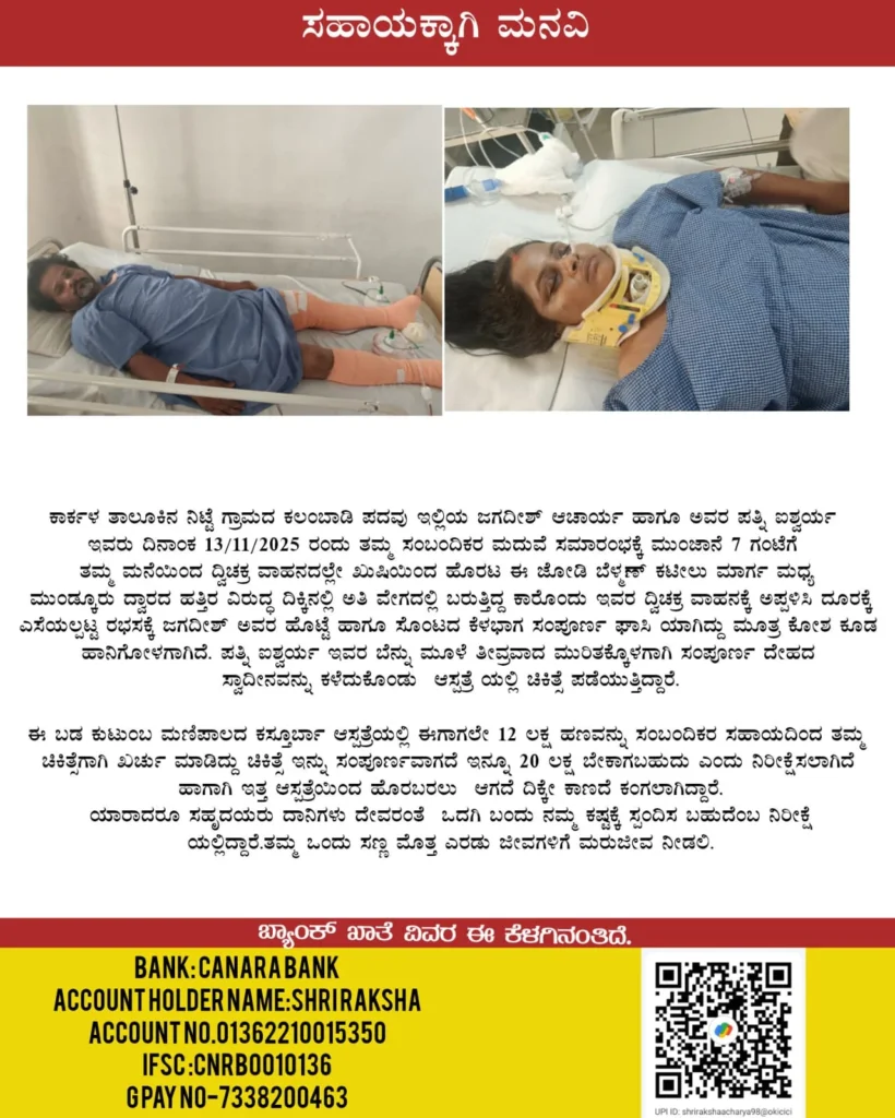 ಮಣಿಪಾಲ: ಇತ್ತೀಚೆಗೆ ರಸ್ತೆ ಅಪಘಾತದಲ್ಲಿ ಗಂಭೀರವಾಗಿ ಗಾಯಗೊಂಡಿರುವ ಜಗದೀಶ್ ಆಚಾರ್ಯ ಮತ್ತು ಐಶ್ವರ್ಯ ದಂಪತಿಗಳು ಪ್ರಸ್ತುತ ಮಣಿಪಾಲದ ಕಸ್ತೂರ್ಬಾ ಆಸ್ಪತ್ರೆಯಲ್ಲಿ ಬದುಕಿಗಾಗಿ ಹೋರಾಟ ನಡೆಸುತ್ತಿದ್ದಾರೆ. ಇವರ ಸ್ಥಿತಿ ಚಿಂತಾಜನಕವಾಗಿದ್ದು, ವೈದ್ಯಕೀಯ ವೆಚ್ಚ ದಿನೇ ದಿನೇ ಹೆಚ್ಚುತ್ತಿರುವ ಹಿನ್ನೆಲೆಯಲ್ಲಿ ಕುಟುಂಬದ ಮೇಲೆ ಭಾರೀ ಆರ್ಥಿಕ ಒತ್ತಡ ಎದುರಾಗಿದೆ.