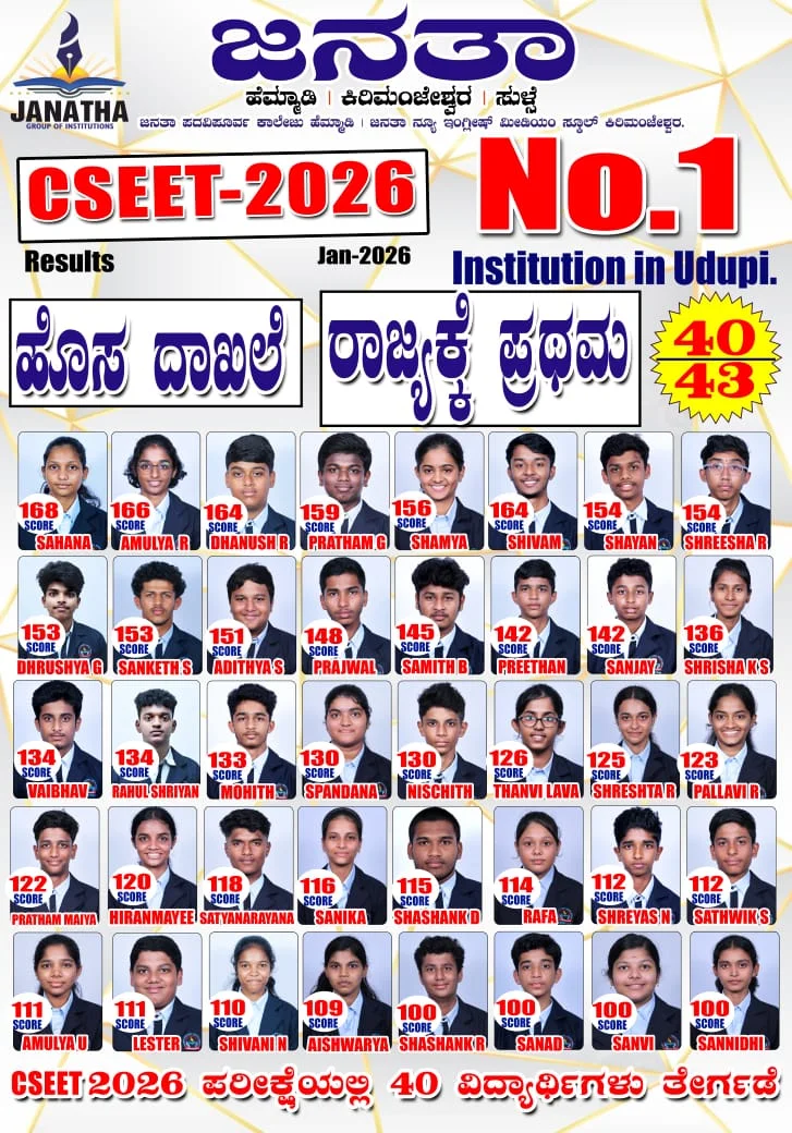 CSEET-ಇನ್ಸ್ಟಿಟ್ಯೂಟ್ ಆಫ್ ಕಂಪನಿ ಸೆಕ್ರೆಟರಿಸ್ ಆಫ್ ಇಂಡಿಯಾ ಇವರು ನಡೆಸುವ ಎಕ್ಸಿಕ್ಯೂಟಿವ್ ಎಂಟ್ರೆನ್ಸ್ ಟೆಸ್ಟ್ (ಅರ್ಹತಾ ಪರೀಕ್ಷೆ)ಯಲ್ಲಿ ಜನತಾ ಪದವಿಪೂರ್ವ ಕಾಲೇಜಿನ ವಿದ್ಯಾರ್ಥಿಗಳು, ಪರೀಕ್ಷೆ ಬರೆದ 43 ವಿದ್ಯಾರ್ಥಿಗಳಲ್ಲಿ 40 ವಿದ್ಯಾರ್ಥಿಗಳು ಅತ್ಯಧಿಕ ಅಂಕಗಳನ್ನು ಪಡೆಯುದರ ಮೂಲಕ CS ಎಕ್ಸಿಕ್ಯೂಟಿವ್ ಪ್ರೋಗ್ರಾಮ್ ಗೆ ಅರ್ಹತೆ ಪಡೆದಿದ್ದಾರೆ.ಸಾಧನೆ ಮೆರೆದು ಅರ್ಹತೆ ಪಡೆದ ವಿದ್ಯಾರ್ಥಿಗಳು ಕ್ರಮವಾಗಿ ಸಹನಾ(168),ಅಮೂಲ್ಯ ಆರ್ ಶೆಟ್ಟಿ (166),ಧನುಷ್ ಆರ್ ಹೆಬ್ಬಾರ್( 164)ಪ್ರಥಮ್ ಜಿ ಕಾಂಚನ್(159),ಶಮ್ಯ(156) ಶಿವಮ್(155),ಶಯನ್(154),ಶ್ರೀಶಾ ಆರ್ ಶೆಟ್ಟಿ (154),ದ್ರಶ್ಯ ಜಿ ದೇವಾಡಿಗ(153),ಸಂಕೇತ್ ಎಸ್ ಬಿಲ್ಲವ(153),ಆದಿತ್ಯ ಆರ್ ಶೆಟ್ಟಿ (151),ಪ್ರಜ್ವಲ್(148),ಶಮಿತ್ ಬಿ ಪೂಜಾರಿ(145),ಪ್ರೀಥನ್ (142),ಸಂಜಯ್(142),ಶ್ರೀಶಾ ಕೆ.ಎಸ್ (136),ವೈಭವ್(134), ರಾಹುಲ್ ಶ್ರೀಯಾನ್( 134) ಮೋಹಿತ್(133), ಸ್ಪಂದನ (130),ನಿಶ್ಚಿತ್ (130),ಪೂಜಾರಿ ತನ್ವಿ ಲವ (126),ಶ್ರೇಷ್ಠ ಆರ್ ನಾಯಕ್(125),ಪಲ್ಲವಿ ಆರ್ ಪೂಜಾರಿ (123),ಪ್ರಥಮ್ ಮಯ್ಯ(122),ಹಿರಣ್ಮಯಿ(120),ಸತ್ಯನಾರಾಯಣ (118),ಸಾನಿಕ(116),ಶಶಾಂಕ್ ಡಿ ರಾವ್(115),ಶ್ರೇಯಸ್ ಎನ್ ಪೂಜಾರಿ (112),ರಫಾ(114) ಸಾತ್ವಿಕ್ ಶೆಟ್ಟಿ (112),ಅಮೂಲ್ಯ ಯು ಗಾಣಿಗ(111),ಲೆಸ್ಟರ್ (111),ಶಿವಾನಿ ಎನ್ (110),ಐಶ್ವರ್ಯ (109),ಶಶಾಂಕ್ ಆರ್ ನಾಯಕ್(100),ಸನದ್ (100),ಸಾನ್ವಿ (100),ಸನ್ನಿಧಿ (100) ಗ್ರಾಮೀಣ ಭಾಗದ ಪರಿಸರದಲ್ಲಿ ಆರಂಭಗೊಂಡಿರುವ ಶಿಕ್ಷಣ ಸಂಸ್ಥೆಯಲ್ಲಿ ಸ್ಪರ್ಧಾತ್ಮಕ ಪರೀಕ್ಷೆಗಳಿಗೆ ಅತ್ಯುತ್ತಮ ತರಬೇತಿ ನೀಡುತ್ತಾ ಉತ್ತಮ ಶಿಕ್ಷಣ ನೀಡಲಾಗುತ್ತಿದೆ.