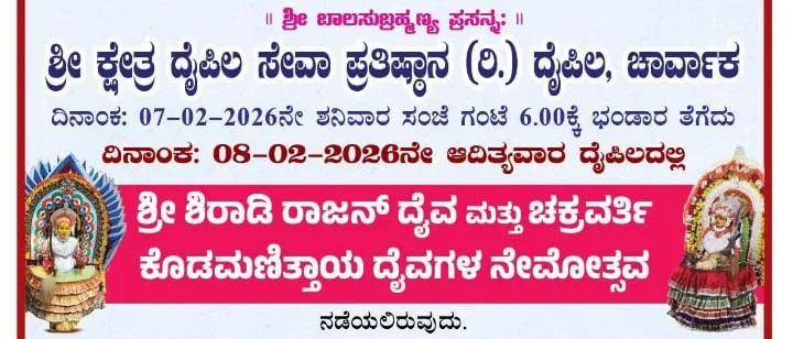ದೈಪಿಲ : ಫೆ.7-8ರವರೆಗೆ ಶ್ರೀ ಶಿರಾಡಿ ರಾಜನ್ ದೈವ ಮತ್ತು ಚಕ್ರವರ್ತಿ ಕೊಡಮಣಿತ್ತಾಯ ದೈವಗಳ ನೇಮೋತ್ಸವ