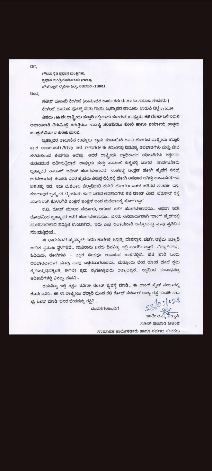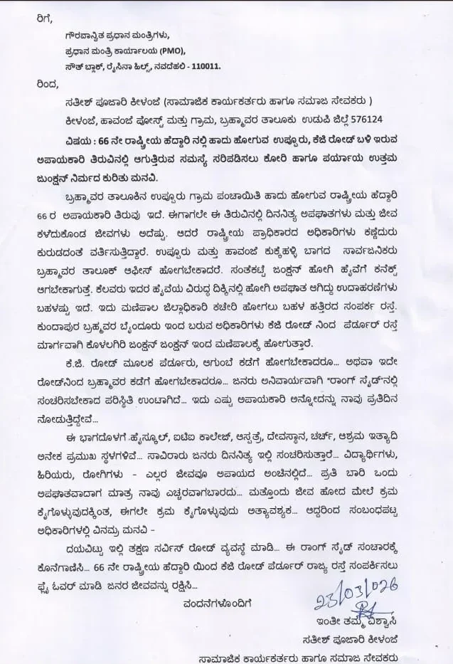 ಉದ್ದೂರು ಕೆಜಿ ರೋಡ್ ಬಳಿ ಅಪಾಯಕಾರಿ ತಿರುವು: ಜೀವ ಹಾನಿ ತಪ್ಪಿಸಲು ತಕ್ಷಣ ಫ್ಲೈಓವರ್ ಹಾಗೂ ಸರ್ವಿಸ್ ರೋಡ್ ನಿರ್ಮಾಣಕ್ಕೆ ಪ್ರಧಾನಮಂತ್ರಿ ನರೇಂದ್ರ ಮೋದಿ ಅವರಿಗೆ ಮನವಿ