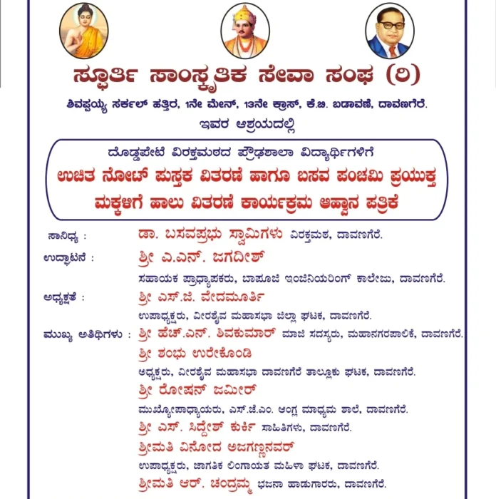 ದಾವಣಗೆರೆ: ಸ್ಫೂರ್ತಿ ಸಾಂಸ್ಕೃತಿಕ ಸೇವಾ ಸಂಘ (ರಿ) ದಾವಣಗೆರೆ ಇವರ ಆಶ್ರಯದಲ್ಲಿ ದೊಡ್ಡಪೇಟೆ ವಿರಕ್ತಮಠದ ಪ್ರೌಢಶಾಲಾ ವಿದ್ಯಾರ್ಥಿಗಳಿಗೆ ಉಚಿತ ನೋಟ್ ಪುಸ್ತಕ ವಿತರಣೆ ಹಾಗೂ ಬಸವ ಪಂಚಮಿ ಪ್ರಯುಕ್ತ ಮಕ್ಕಳಿಗೆ ಹಾಲು ವಿತರಣೆ ಕಾರ್ಯಕ್ರಮ ಆ. ೩೧ರಂದು ವಿರಕ್ತಮಠ, ದೊಡ್ಡಪೇಟೆ, ದಾವಣಗೆರೆ ಇಲ್ಲಿ ನಡೆಯಲಿದೆ.