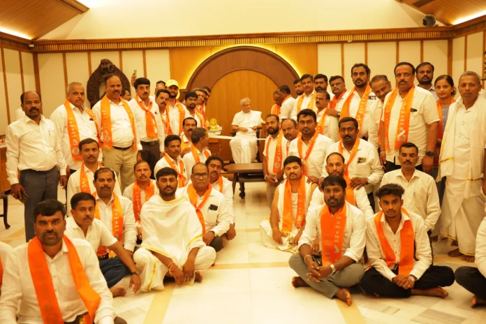 ಉಜಿರೆ: ಬೆಂಗಳೂರಿನ ವಕೀಲರಾದ ನಾರಾಯಣ ಸ್ವಾಮಿ ಮತ್ತು ರಮೇಶ್ ಗೌಡರು ಮತ್ತು ಹಾಸನದ ವಕೀಲರ ಸಂಘದ ಅಧ್ಯಕ್ಷ ಮೊಗಣ್ಣ ಗೌಡ ನೇತೃತ್ವದಲ್ಲಿ 450 ಮಂದಿ ವಕೀಲರ ನಿಯೋಗ 90 ಕಾರುಗಳ ಜಾಥಾದಲ್ಲಿ ಶನಿವಾರ ಸಂಜೆ ಧರ್ಮಸ್ಥಳಕ್ಕೆ ಬಂದು ಧರ್ಮಾಧಿಕಾರಿ ಡಿ. ವೀರೇಂದ್ರ ಹೆಗ್ಗಡೆಯವರನ್ನು ಭೇಟಿಯಾಗಿ ಆಶೀರ್ವಾದ ಪಡೆದರು.