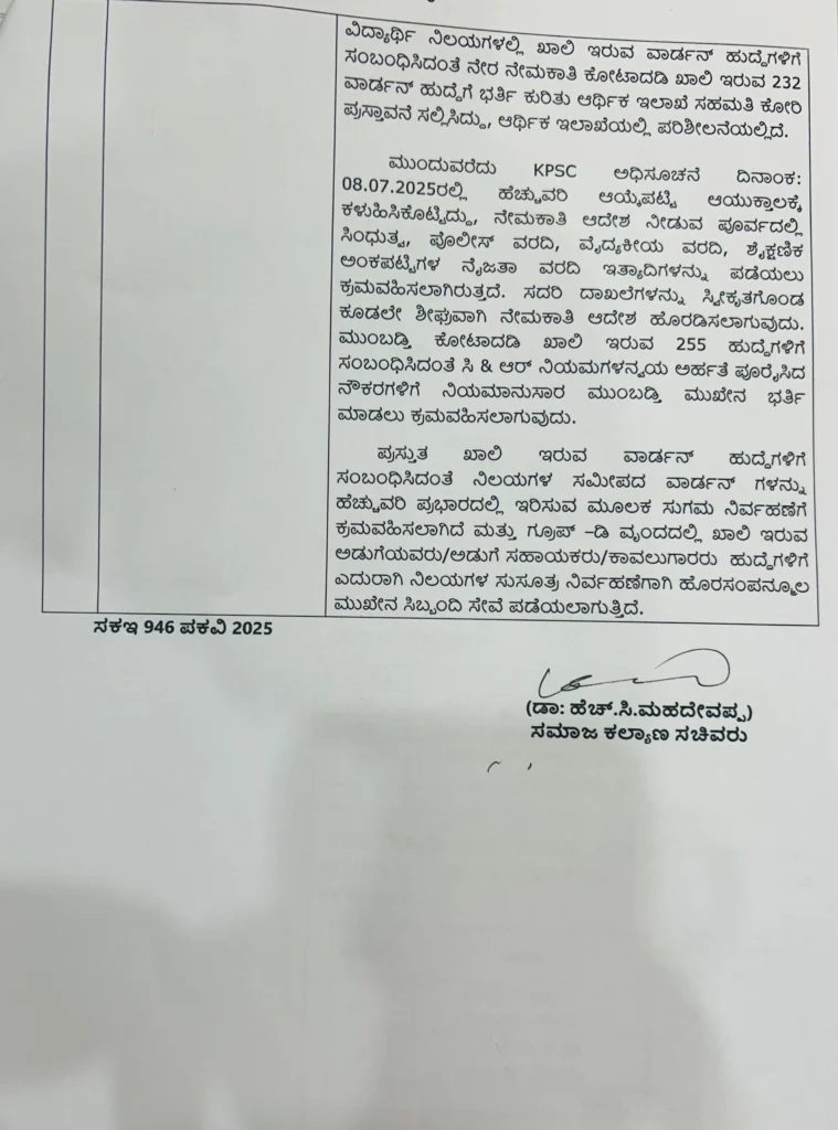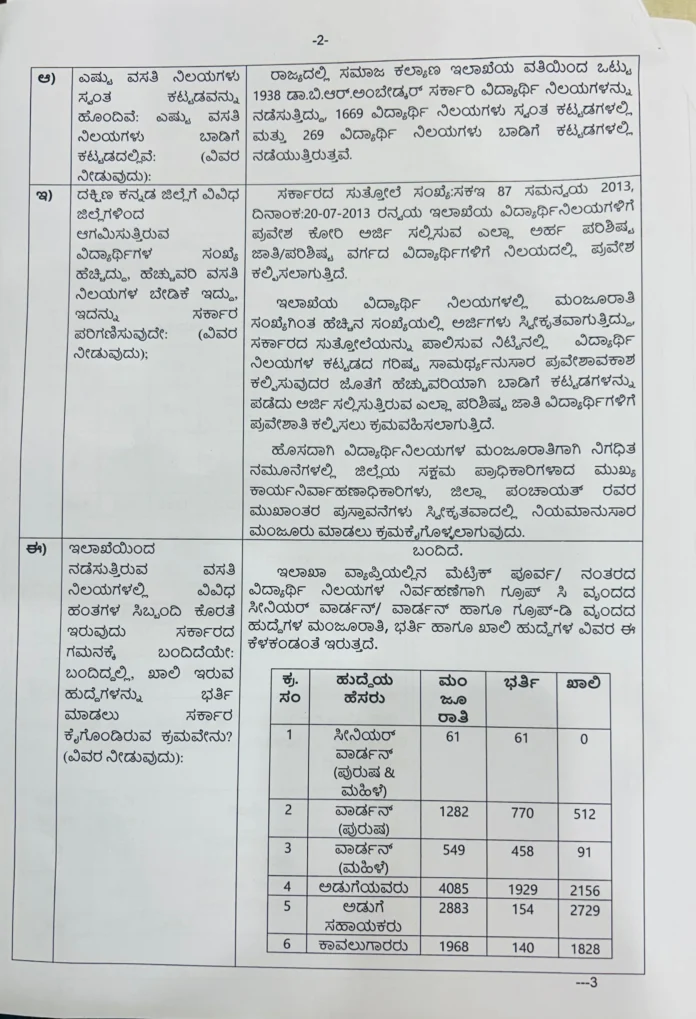ಇಲಾಖೆಯ ವಿದ್ಯಾರ್ಥಿ ನಿಲಯಗಳಲ್ಲಿ ಮಂಜೂರಾತಿ ಸಂಖ್ಯೆಗಿಂತ ಹೆಚ್ಚಿನ ಸಂಖ್ಯೆಯಲ್ಲಿ ಅರ್ಜಿಗಳು ಸ್ವೀಕೃತವಾಗುತ್ತಿದ್ದು ವಿದ್ಯಾರ್ಥಿ ನಿಲಯಗಳ ಗರಿಷ್ಠ ಸಾಮರ್ಥ್ಯನುಸಾರ ಪ್ರವೇಶಾವಕಾಶ ಕಲ್ಪಿಸುವುದರ ಜೊತೆಗೆ ಹೆಚ್ಚುವರಿ ಬಾಡಿಗೆ ಕಟ್ಟಡಗಳನ್ನು ಪಡೆದು ಅರ್ಜಿಗಳು ಸಲ್ಲಿಸುತ್ತಿರುವ ಎಲ್ಲಾ ಪ. ಜಾತಿ ವಿದ್ಯಾರ್ಥಿಗೆ ಪ್ರವೇಶಾತಿ ಕಲ್ಪಿಸಲು ಕ್ರಮವಹಿಸಲಾಗುತ್ತಿದೆ . ಹಾಗೂ ವಿದ್ಯಾರ್ಥಿ ನಿಲಯದಲ್ಲಿ ಖಾಲಿ ಇರುವ ವಾರ್ಡ್ನ್ ಹುದ್ದಗೆಳಿಗೆ ನೇರ ನೇಮಕಾತಿ ಕೋಟಾದಡಿ 232 ವಾರ್ಡ್ನ್ ಹುದ್ದೆಗೆ ಭರ್ತಿ ಕುರಿತು ಪ್ರಸ್ತಾವನೆ ಸಲ್ಲಿಸಿದ್ದು ಪರಿಶೀಲನೆಯಲ್ಲಿದೆ ಎಂದು ಸಚಿವರು ಉತ್ತರಿಸಿದ್ದಾರೆ .