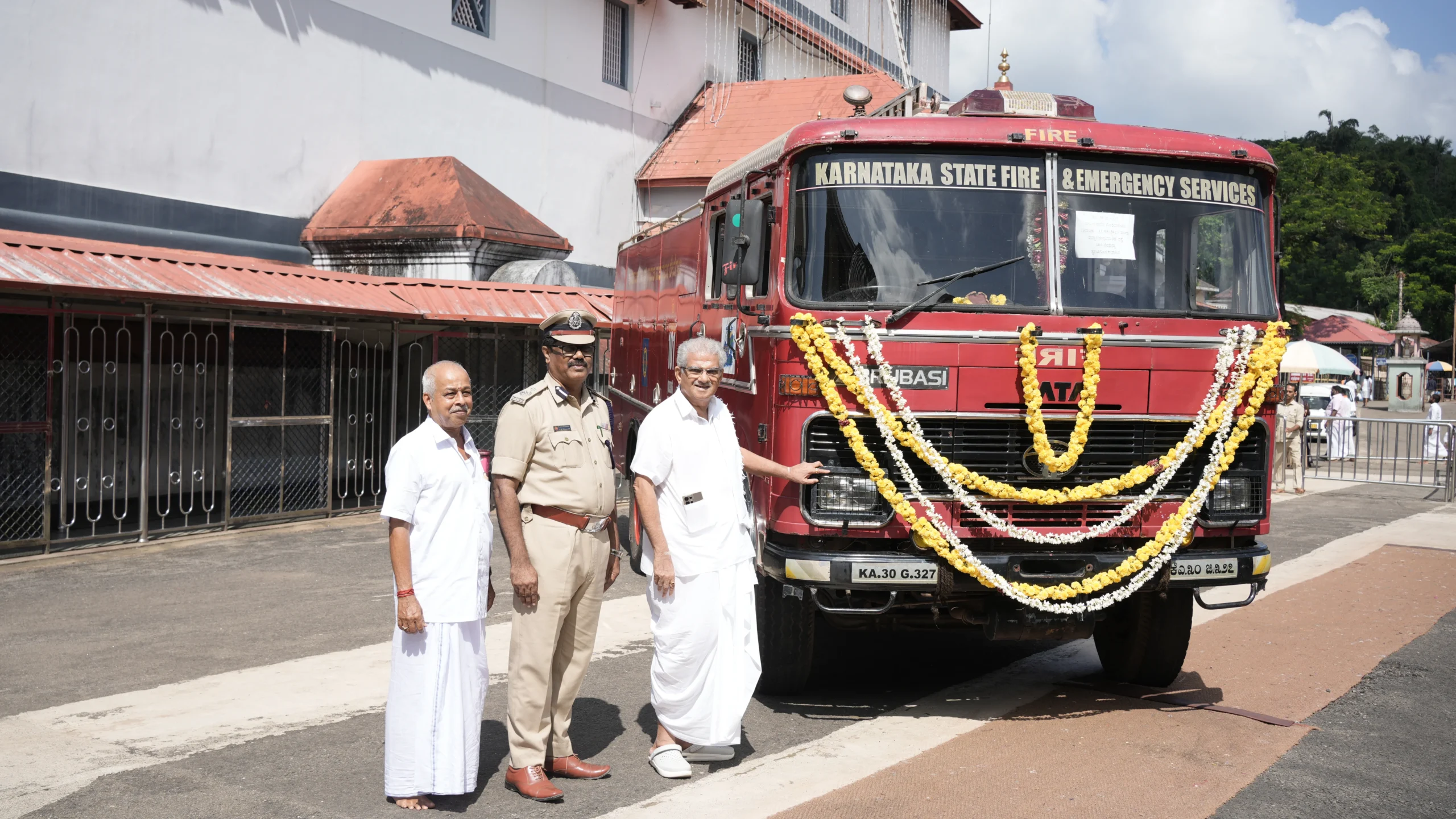 ಚಿತ್ರ: ಮಂಗಳೂರಿನ ಮುಖ್ಯ ಅಗ್ನಿಶಾಮಕ ಅಧಿಕಾರಿ ಬಿ.ಎಂ. ತಿರುಮಲೇಶ್ ಇಲಾಖೆಯ ಅಗ್ನಿಶಾಮಕ ವಾಹನವನ್ನು ಧರ್ಮಾಧಿಕಾರಿ ಡಿ. ವೀರೇಂದ್ರ ಹೆಗ್ಗಡೆಯವರಿಗೆ ಹಸ್ತಾಂತರಿಸಿದರು.