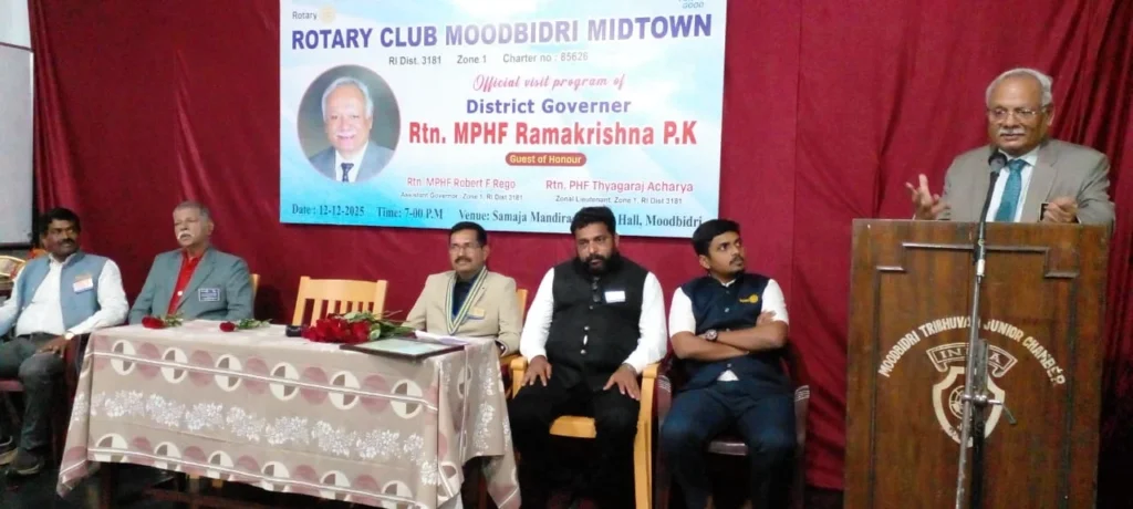 ಮೂಡುಬಿದಿರೆ: ರೋಟರಿ ಜಿಲ್ಲೆ 3181ರ ಜಿಲ್ಲಾ ರಾಜ್ಯಪಾಲ ರೊ. ರಾಮಕೃಷ್ಣ ಪಿ.ಕೆ.ಯವರು ಡಿ. 12ರಂದು ರೋಟರಿ ಕ್ಲಬ್ ಆಫ್ ಮೂಡುಬಿದ್ರಿ ಮಿಡ್ ಟೌನ್ ಗೆ ಅಧಿಕೃತ ಭೇಟಿ ನೀಡಿದರು. ಈ ಸಂದರ್ಭ ಅವರು ಕ್ಲಬ್ ವತಿಯಿಂದ ಹಮ್ಮಿಕೊಂಡಿರುವ ವಿವಿಧ ಸೇವಾ ಕಾರ್ಯಕ್ರಮಗಳನ್ನು ವೀಕ್ಷಿಸಿ ಸಂತೃಪ್ತಿ ವ್ಯಕ್ತಪಡಿಸಿದರು.