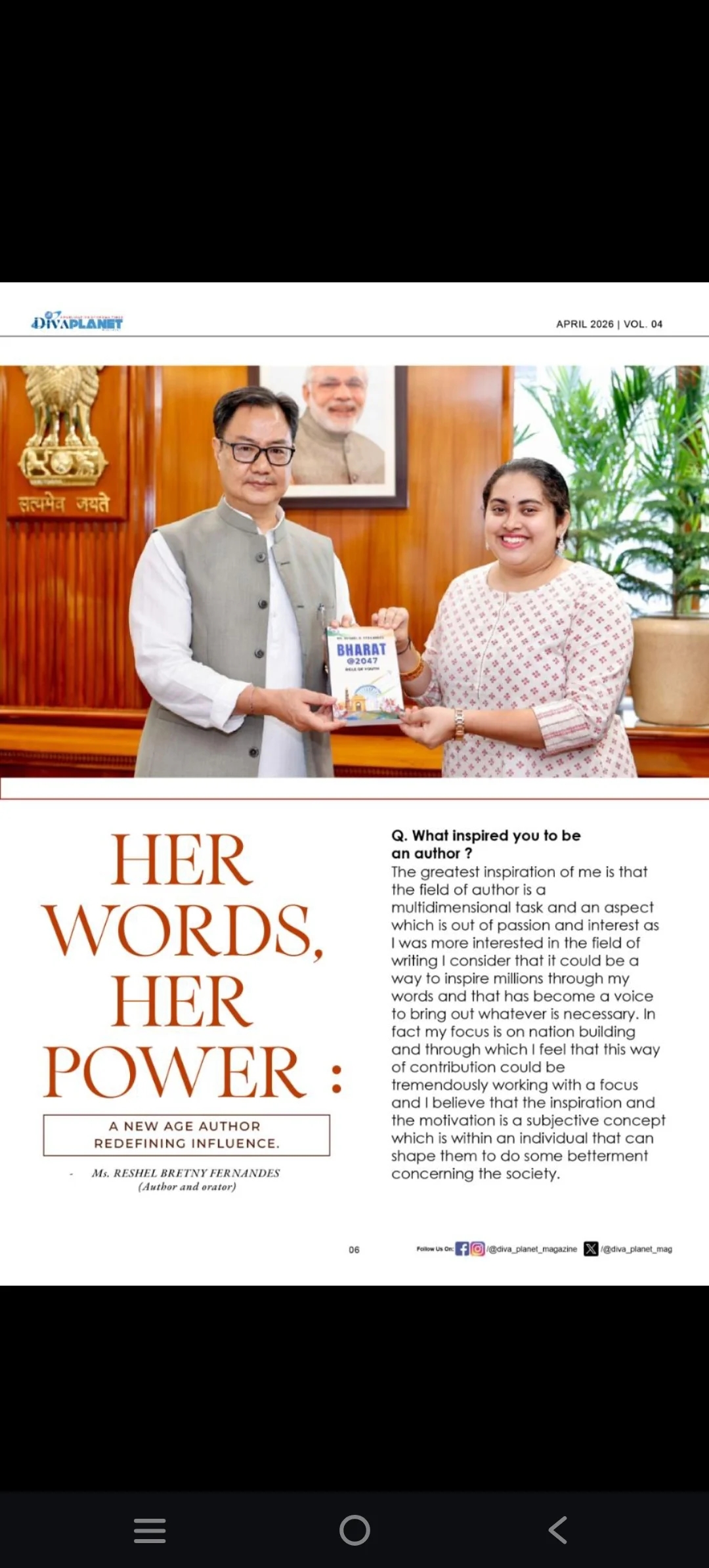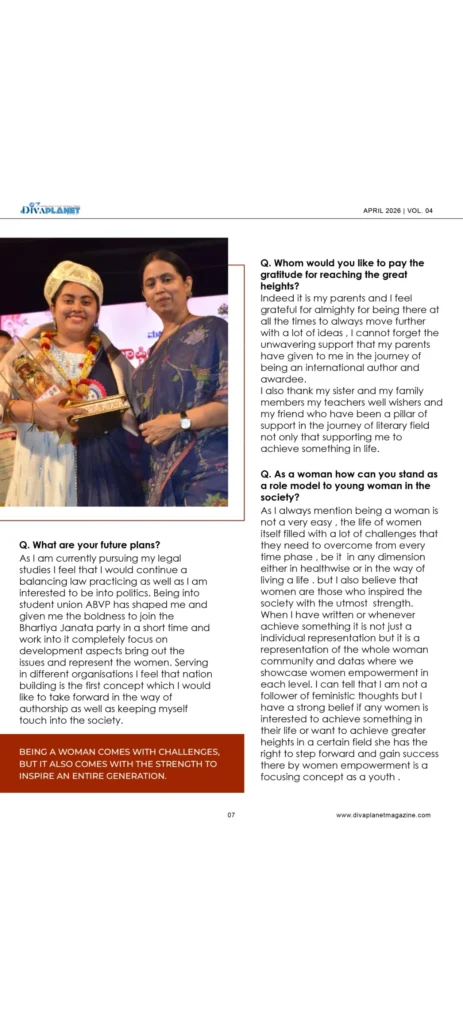 2025 ರ ಟಾಪ್ 10 ಲೇಖಕರಲ್ಲಿ ಅವರು 200 ಮಾಧ್ಯಮಗಳಲ್ಲಿ ಪಟ್ಟಿ ಮಾಡಲಾದ ಮತ್ತು ಆಧುನಿಕ ಭಾರತದ ಧ್ವನಿ ಎಂದು ಕರೆಯಲ್ಪಡುವ 2025 ರ ಪ್ರಮುಖ 10 ಲೇಖಕರಲ್ಲಿ ಒಬ್ಬರು. ಇತ್ತೀಚೆಗೆ ಪ್ರಕಟವಾದ ಅದ್ಭುತ ಭಾರತ ದೃಷ್ಟಿ ವಿಕ್ಷಿತ ಭಾರತ ಎಂಬ ಪುಸ್ತಕ ದಿವಾ ಪ್ಲಾನೆಟ್ ನಿಯತಕಾಲಿಕೆಯಲ್ಲಿ ಅವರ ಸಂದರ್ಶನವು “HER WORDS HER POWER” ಎಂಬ ಶೀರ್ಷಿಕೆಯಡಿಯಲ್ಲಿ ಪುಟ 6 ಮತ್ತು 7 ರಲ್ಲಿ ಮಹಿಳಾ ಶಕ್ತಿಯ ಶಕ್ತಿಯನ್ನು ಶ್ಲಾಘಿಸುತ್ತದೆ.