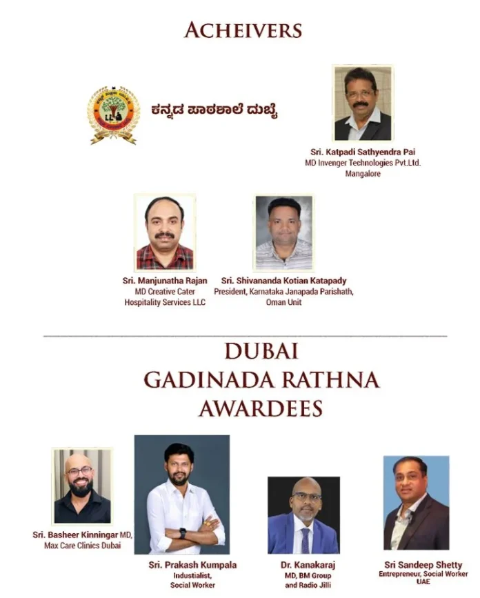 ಸಾಧಕ ಸಂಸ್ಥೆ : ದುಬೈನಲ್ಲಿ ಕಳೆದ ಹಲವಾರು ವರ್ಷಗಳಿಂದ ಕನ್ನಡದ ವಿದ್ಯಾರ್ಥಿಗಳಿಗೆ ನಮ್ಮ ಮಾತೃ ಭಾಷೆಯ ಕಲಿಕಾ ತರಗತಿಯನ್ನು ಉಚಿತವಾಗಿ ನೀಡುತ್ತಿರುವ “ಕನ್ನಡ ಪಾಠ ಶಾಲೆ ದುಬೈ” ಸಂಸ್ಥೆಯನ್ನು ಗೌರವಿಸಲಾಗುವುದು.