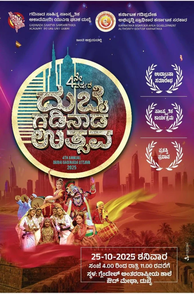 ಅಕ್ಟೋಬರ್ 25 ರಂದು ಸಂಜೆ ನಾಲ್ಕರಿಂದ ರಾತ್ರಿ ಹನ್ನೊಂದರ ವರೆಗೆ ಔದ್ ಮೇಥದ ಗ್ಲೆಂಡೇಲ್ ಅಂತಾರಾಷ್ಟ್ರೀಯ ಶಾಲೆಯ ಸಭಾಂಗಣದಲ್ಲಿ ನಡೆಯುವ ನಾಲ್ಕನೇ ವರ್ಷದ “ದುಬೈ ಗಡಿನಾಡ ಉತ್ಸವ -2025” ದ ಪೋಸ್ಟರ್ ಬಿಡುಗಡೆ ಕಾರ್ಯಕ್ರಮದ ಅಧ್ಯಕ್ಷತೆಯನ್ನು ವಹಿಸಿದ ದುಬೈ ಘಟಕದ ಅಮರ್ ದೀಪ್ ಕಲ್ಲುರಾಯರವರು ಮಾತನಾಡುತ್ತಾ ಕಳೆದ ಮೂರು ವರ್ಷಗಳಿಂದ ದುಬೈನಲ್ಲಿ ಗಡಿನಾಡ ಉತ್ಸವ ಆಚರಿಸುವ ಮೂಲಕ ನಮ್ಮ ಗಡಿನಾಡಿನ ಕಲೆ,ಸಾಹಿತ್ಯ, ಸಂಸ್ಕೃತಿಯನ್ನು ಅನಾವರಣಗೊಳಿಸುತಿದ್ದೆವೆ.ಈ ವರ್ಷ ನಮ್ಮ ನಾಲ್ಕನೇ ವರ್ಷದ ಕಾರ್ಯಕ್ರಮ ಯುಎಇಯಲ್ಲಿ ಇರುವ ಎಲ್ಲಾ ಕನ್ನಡಿಗರೂ ಈ ಉತ್ಸವದಲ್ಲಿ ಪಾಲ್ಗೊಂಡು ಯಶಸ್ವಿಗೊಳಿಸಬೇಕೆಂದು ಕರೆ ನೀಡಿದರು.