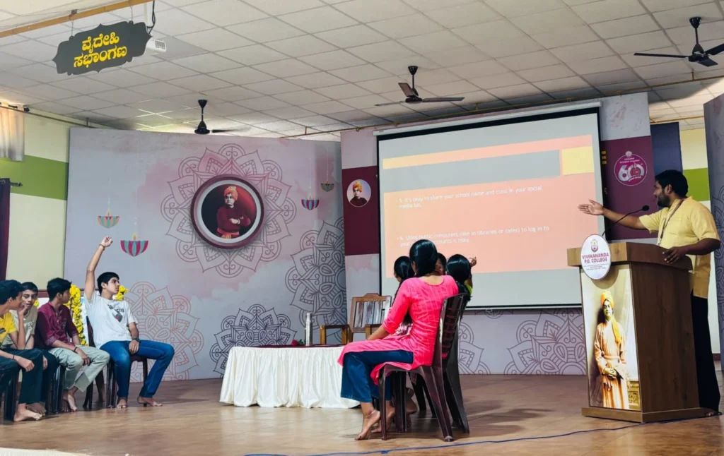 ವಿಷಯದ ಕುರಿತಾಗಿ ವಿದ್ಯಾರ್ಥಿಗಳ ಜೊತೆ ಸಂವಹನ ನಡೆಸಿದ ಅವರು, ಡಿಜಿಟಲ್ ಪ್ರಪಂಚದಲ್ಲಿ ನಾವು ಹೇಗೆ ಮೋಸ ಹೋಗುತ್ತಿದ್ದೇವೆ? ನಮ್ಮ ವೈಯಕ್ತಿಕ ಮಾಹಿತಿಗಳು ಹೇಗೆ ಸೋರಿಕೆಯಾಗುತ್ತಿವೆ? ಕೃತಕ ಬುದ್ಧಿಮತ್ತೆ ಇಲ್ಲಿ ಹೇಗೆ ಕಾರ್ಯವೆಸಗುತ್ತವೆ? ಈ ಮೊದಲಾದ ವಿಷಯಗಳ ಕುರಿತು ಉಪಯುಕ್ತ ಮಾಹಿತಿ ನೀಡುವುದರ ಜೊತೆಗೆ ಸಾಮಾಜಿಕ ಜಾಲತಾಣದ ಬಳಕೆಯ ಸಂದರ್ಭಗಳಲ್ಲಿ ವಹಿಸಬೇಕಾದ ಮುನ್ನೆಚ್ಚರಿಕಾ ಕ್ರಮಗಳ ಕುರಿತು ಅರಿವು ಮೂಡಿಸಿದರು. ಬಳಿಕ, ಎರಡನೇ ಅವಧಿಯಲ್ಲಿ ಭೌತಶಾಸ್ತ್ರ ಹಾಗೂ ರಸಾಯನ ಶಾಸ್ತ್ರ ವಿಷಯಗಳ ಪ್ರಾಯೋಗಿಕ ಪ್ರಾತ್ಯಕ್ಷಿಕೆಯನ್ನು ವಿವೇಕಾನಂದ ಪದವಿಪೂರ್ವ ಕಾಲೇಜಿನ ವಿಜ್ಞಾನ ವಿಭಾಗದ ಉಪನ್ಯಾಸಕ ವೃಂದದವರು ನಡೆಸಿಕೊಟ್ಟರು.