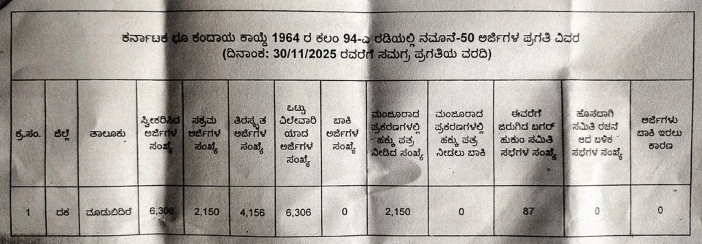 ಕರ್ನಾಟಕ ಭೂ ಕಂದಾಯ ಕಾಯ್ದೆ 1964ರ ಕಲಂ 94ಎ ನಾಲ್ಕರ ಅಡಿಯಲ್ಲಿ ನಮೂನೆ 57ರ ಅರ್ಜಿ ಒಟ್ಟು 7,338 ಸ್ವೀಕರಿಸಿದ್ 4,337 ಅರ್ಜುಗಳನ್ನು ತಿರಸ್ಕರಿಸಲಾಗಿದೆ. ಇದರಲ್ಲಿ ಕೇವಲ 12 ಸಕ್ರಮ ಪ್ರಕರಣಗಳನ್ನು ಮಾತ್ರ ವಿಲೇವಾರಿ ಮಾಡಲಾಗಿದೆ ಉಳಿದಂತೆ 2,989 ಅರ್ಜಿಗಳು ವಿಲೇವಾರಿಗೆ ಬಾಕಿ ಇರುತ್ತವೆ. ತಿರಸ್ಕೃತಗೊಂಡ ಅರ್ಜಿಯ ಬಗ್ಗೆ ಸಂಬಂಧಪಟ್ಟ ಅರ್ಜಿದಾರರಿಗೆ ಯಾವುದೇ ರೀತಿಯ ಮಾಹಿತಿಯನ್ನು ಕೂಡ ಈತನಕ ನೀಡಿಲ್ಲ ಎಂದು ಬಗರ್ ಹುಕುಂ, ಅಕ್ರಮ ಸಕ್ರಮ ಸಮಿತಿಯ ಸದಸ್ಯರುಗಳಾದ ಮಿತ್ತಬೈಲು ವಾಸುದೇವ ನಾಯಕ್, ಕರುಣಾಕರ ಹಾಗೂ ಮರಿನಾಮಿನೇಜಸ್ ಅವರುಗಳು ಆಪಾದಿಸಿದ್ದಾರೆ.