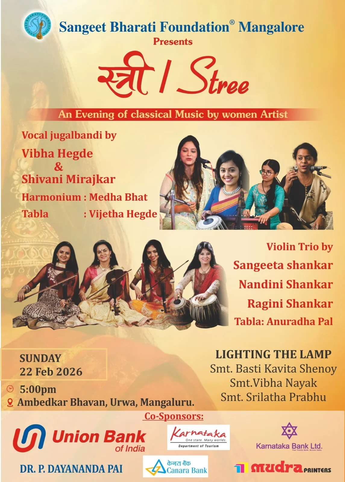ಫೆಬ್ರವರಿ22ರ ಸಂಜೆ ಅಂಬೇಡ್ಕರ್‌ ಭವನದ ಸಭಾಂಗಣದಲ್ಲಿ ಮಂಗಳೂರಿನ ಸಂಗೀತ ಭಾರತಿ ಫೌಂಡೇಶನ್‌ಪ್ರಸ್ತುತ ಪಡಿಸುವ ಉತ್ಕೃಷ್ಟ ಮಟ್ಟದ ‘ಸ್ತ್ರೀ’ ಪರಿಕಲ್ಪನೆಯ ವಿನೂತನ ಶಾಸ್ತ್ರಿಯ ಸಂಗೀತ ಕಾರ್ಯಕ್ರಮ