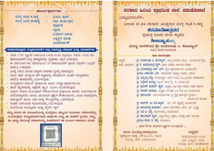 ​ದಿನಾಂಕ 12-04-2026ರಂದು ಭಾನುವಾರ ಬೆಳಿಗ್ಗೆ 9:30ಕ್ಕೆ ಶಾಲಾ ಆವರಣದಲ್ಲಿ ಅತ್ಯಂತ ಸಡಗರದಿಂದ ಶತಮಾನೋತ್ಸವದ ಪ್ರಯುಕ್ತ ನೂತನ ಶಾಲಾ ಕಟ್ಟಡದ ಶಿಲಾನ್ಯಾಸ ಕಾರ್ಯಕ್ರಮ ನಡೆಯಲಿದೆ.