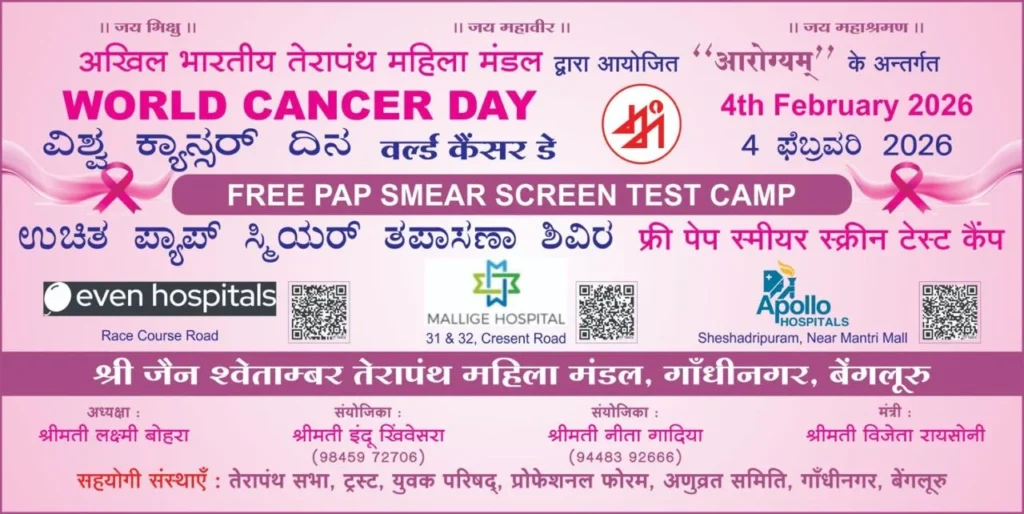 ಅಖಿಲ ಭಾರತ ಥೇರಾ ಪಂಥ ಮಹಿಳಾ ಮಂಡಳದಿಂದ ಸರ್ವೈಕಲ್ ಪೆ. 4 ರಂದು ಉಚಿತ ಕ್ಯಾನ್ಸರ್ ತಪಾಸಣೆ ಮತ್ತು ಚಿಕಿತ್ಸೆ ಅಭಿಯಾನ
