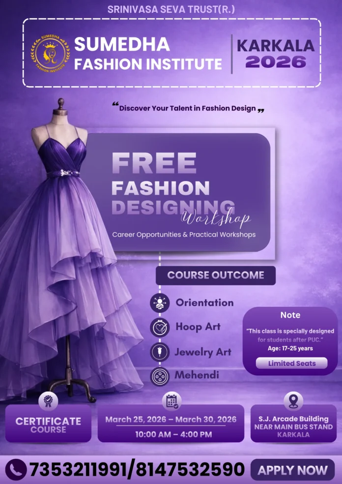 ಈ ವರ್ಕ್ಶಾಪ್ ಮಾರ್ಚ್ 25 ರಿಂದ ಮಾರ್ಚ್ 30, 2026 ರವರೆಗೆ ಪ್ರತಿದಿನ ಬೆಳಿಗ್ಗೆ 10:00ರಿಂದ ಸಂಜೆ 4:00ರವರೆಗೆ ಎಸ್.ಜೆ. ಆರ್ಕೇಡ್ ಬಿಲ್ಡಿಂಗ್, ಕಾರ್ಕಳದಲ್ಲಿ ನಡೆಯಲಿದೆ. ಫ್ಯಾಷನ್ ಕ್ಷೇತ್ರದಲ್ಲಿ ಆಸಕ್ತಿ ಹೊಂದಿರುವ ಯುವಕರಿಗೆ ಇದು ಉತ್ತಮ ಅವಕಾಶವಾಗಿದ್ದು, Orientation, Hoop Art, Jewelry Making, Mehendi ಸೇರಿದಂತೆ ಹಲವು ಪ್ರಾಯೋಗಿಕ ತರಬೇತಿಗಳನ್ನು ನೀಡಲಾಗುತ್ತದೆ.