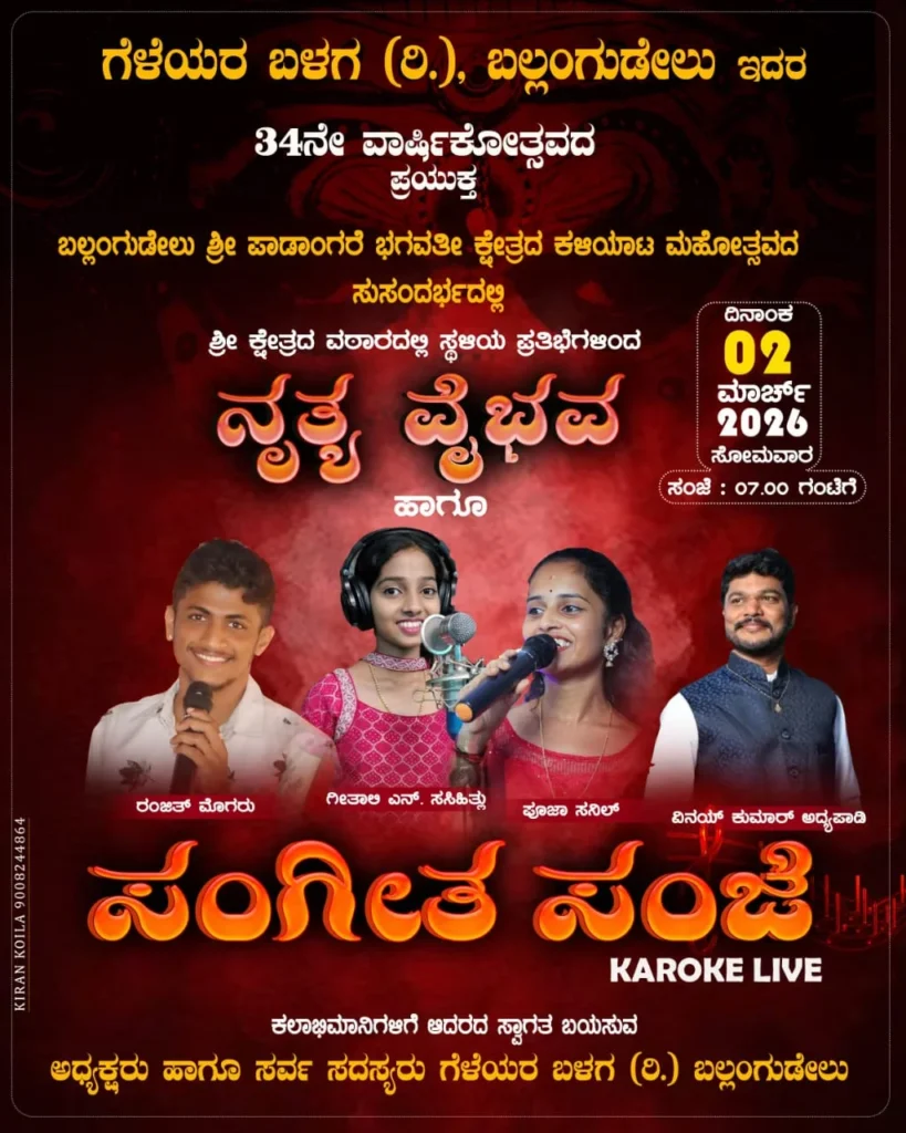 ಮಂಜೇಶ್ವರ : ಗೆಳೆಯರ ಬಳಗ (ರಿ) ಬಲ್ಲಂಗುಡೆಲು ಪಟ್ಟತ್ತಮೊಗರು ಮಜಿಬೈಲು ಇದರ 34 ನೇ ವರ್ಷದ ವಾರ್ಷಿಕೋತ್ಸವವು ಮಾ.2 ಮತ್ತು ಮಾ.3 ರಂದು ಬಲ್ಲಂಗುಡೆಲು ಶ್ರೀ ಪಾಡಂಗರೆ ಭಗವತಿ ಕ್ಷೇತ್ರದ ವಠಾರದಲ್ಲಿ ಜರಗಲಿದೆ.