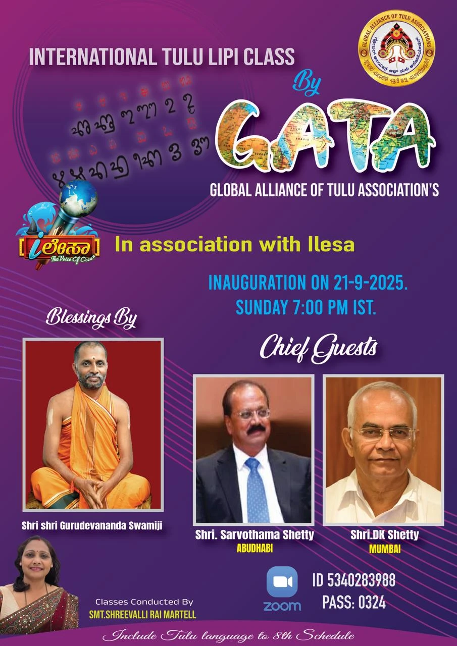 ಅಂತರಾಷ್ಟ್ರೀಯ ತುಳು ಸಂಸ್ಥೆ ಮತ್ತು ಐಲೇಸಾ ಸಹಯೋಗದಲ್ಲಿ ಹತ್ತು ದಿನಗಳ ಲಿಪಿ ಕಾರ್ಯಾಗಾರ ಇಂದು ಸಂಜೆ 7:00 ಗಂಟೆಗೆ ಆರಂಭವಾಗಲಿದೆ. America, Australia, UK , ಮುಂಬೈ ಮತ್ತು ಬೆಂಗಳೂರಿನ ತುಳು ಭಾಷಾ ಪ್ರೇಮಿಗಳಿಂದ ಈ ಕಾರ್ಯಕ್ರಮ ನಡೆಯಲಿದೆ.