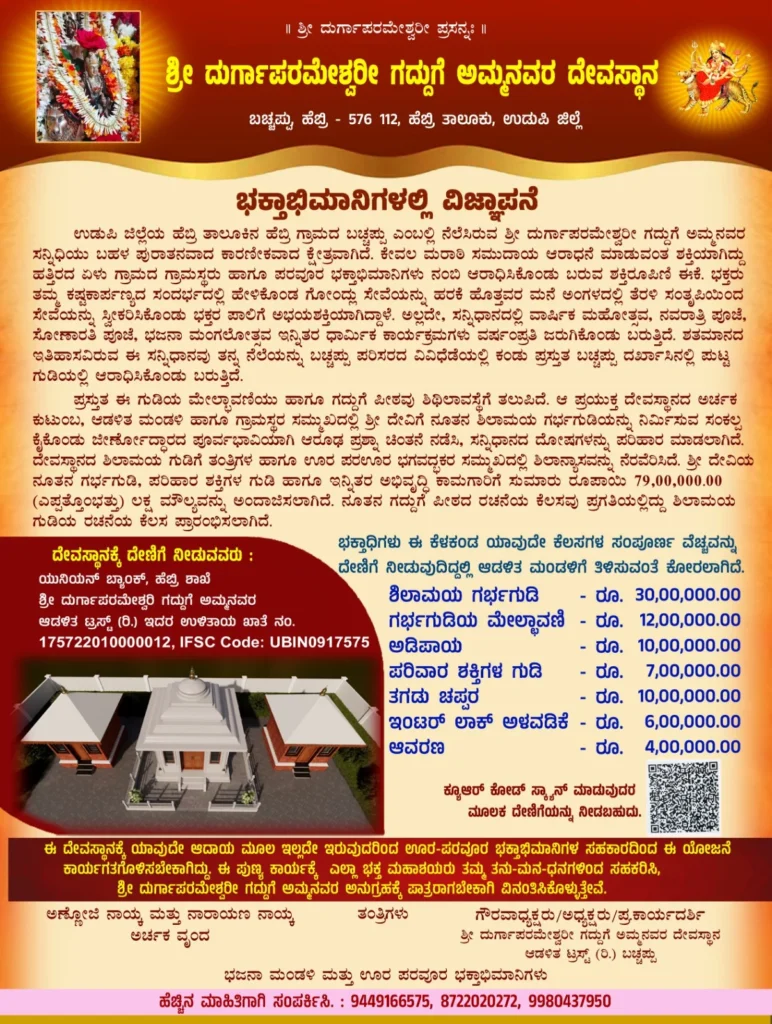 ಹೆಬ್ರಿ : ಶ್ರೀ ದುರ್ಗಾಪರಮೇಶ್ವರಿ ಗದ್ದುಗೆ ಅಮ್ಮನವರ ದೇವಸ್ಥಾನ ಬಚ್ಚಪ್ಪು ಹೆಬ್ರಿ, ಇದರ ನೂತನ ಶಿಲಾಮಯ ಗರ್ಭಗುಡಿ ಹಾಗೂ ಇನ್ನಿತರ ಕಾಮಗಾರಿ ಕುರಿತು ವಿಜ್ಞಾಪನಾ ಪತ್ರವನ್ನು ಬಿಡುಗಡೆ ಮಾಡಲಾಯಿತು. ನಾವೆಲ್ಲರೂ ಸೇರಿಕೊಂಡು ಯಾವುದೇ ಪರಬೇದವಿಲ್ಲದೇ ತಾಯಿಯ ಜೀರ್ಣೋದ್ದಾರ ಕಾರ್ಯಕ್ಕೆ ಕೈ ಜೋಡಿಸೋಣ, ಈ ಒಂದು ಪುಣ್ಯ ಕಾರ್ಯದಲ್ಲಿ ಎಲ್ಲಾ ಭಗವದ್ಭಕ್ತರು ಸಹಕಾರ ನೀಡಬೇಕೆಂದು ಹೆಬ್ರಿ ವ್ಯ. ಸೇ. ಸ. ಸಂಘದ ಅಧ್ಯಕ್ಷರಾದ ನವೀನ್ ಕೆ. ಆಡ್ಯಾoತಾಯ ತಿಳಿಸಿದರು. ಈ ಸಂದರ್ಭದಲ್ಲಿ ಹೆಬ್ರಿ ಗ್ರಾ. ಪಂ. ಅಧ್ಯಕ್ಷರಾದ ತಾರಾನಾಥ ಬಂಗೇರ, ಹೆಚ್. ಗಣೇಶ್ ಕುಮಾರ್, ರಾಘವೇಂದ್ರ ನಾಯ್ಕ, ಆಶಾ ಕರುಣಾಕರ ಹೆಗ್ಡೆ, ತಂತ್ರಿಗಳಾದ ಬಾಲಕೃಷ್ಣ ಭಟ್, ಅರ್ಚಕರಾದ ಅಣ್ಣೋಜಿ ನಾಯ್ಕ, ಹರೀಶ್ ಶೆಟ್ಟಿಗಾರ್ ಮತ್ತಿತರ ಗಣ್ಯರು, ಗ್ರಾಮಸ್ಥರು ಉಪಸ್ಥಿತರಿದ್ದರು. ಮಹಾಬಲ ನಾಯ್ಕ ಪ್ರಸ್ತಾವನೆಗೈದು ಹಾಗೂ ಸ್ವಾಗತಿಸಿ, ಸುರೇಶ ನಾಯ್ಕ ವಂದಿಸಿದರು.