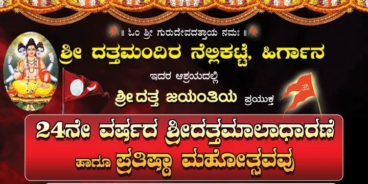 ಶ್ರೀ ದತ್ತಮಂದಿರ ನೆಲ್ಲಿಕಟ್ಟೆ, ಹಿರ್ಗಾನ ಇದರ ಆಶ್ರಯದಲ್ಲಿ ಶ್ರೀ ದತ್ತ ಜಯಂತಿಯ ಪ್ರಯುಕ್ತ 24ನೇ ವರ್ಷದ ಶ್ರೀದತ್ತಮಾಲಾಧಾರಣೆ ಹಾಗೂ ಪ್ರತಿಷ್ಠಾ ಮಹೋತ್ಸವವು ದಿನಾಂಕ : 02-12-2025 ಮಂಗಳವಾರ ಸಂಜೆ ಗಂಟೆ 6.00ಕ್ಕೆ ಮಹಾಪೂಜೆ, ಪ್ರಸಾದ ವಿತರಣೆ ಮತ್ತು ಅನ್ನಸಂತರ್ಪಣೆ ನಡೆಯಲಿದೆ. ಸಂಜೆ ಗಂಟೆ 6.30ರಿಂದ ಶ್ರೀ ಅಂಬಿಕಾ ಅನ್ನಪೂರ್ಣೇಶ್ವರಿ ಪ್ರಸಾದಿತ ದಶಾವತಾರ ಯಕ್ಷಗಾನ ಮಂಡಳಿ ಸುಂಕದಕಟ್ಟೆ ಬಜಪೆ ಡಾ| ಅಮೃತ ಸೋಮೇಶ್ವರ ವಿರಚಿತ ಅಮರ ಶಿಲ್ಪಿ ವೀರ ಶಂಭು ಕಲ್ಕುಡ ತುಳು ಯಕ್ಷಗಾನ ಪ್ರದರ್ಶನಗೊಳ್ಳಲಿದೆ.