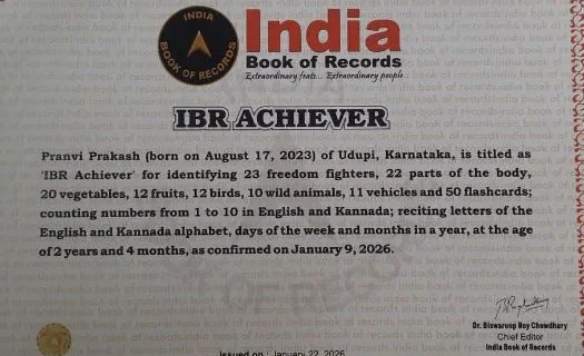 ಉಡುಪಿ, ಕರ್ನಾಟಕದ ಪ್ರಣ್ವಿ ಪ್ರಕಾಶ್ (ಜನನ: ಆಗಸ್ಟ್ 17, 2023) ಅವರು ಅತ್ಯಂತ ಕಿರಿಯ ವಯಸ್ಸಿನಲ್ಲಿ ವಿಶಿಷ್ಟ ಸಾಧನೆ ಮಾಡಿದ್ದು, ಐಬಿಆರ್ ಅಚೀವರ್ (IBR Achiever) ಎಂಬ ಗೌರವಕ್ಕೆ ಪಾತ್ರರಾಗಿದ್ದಾರೆ.