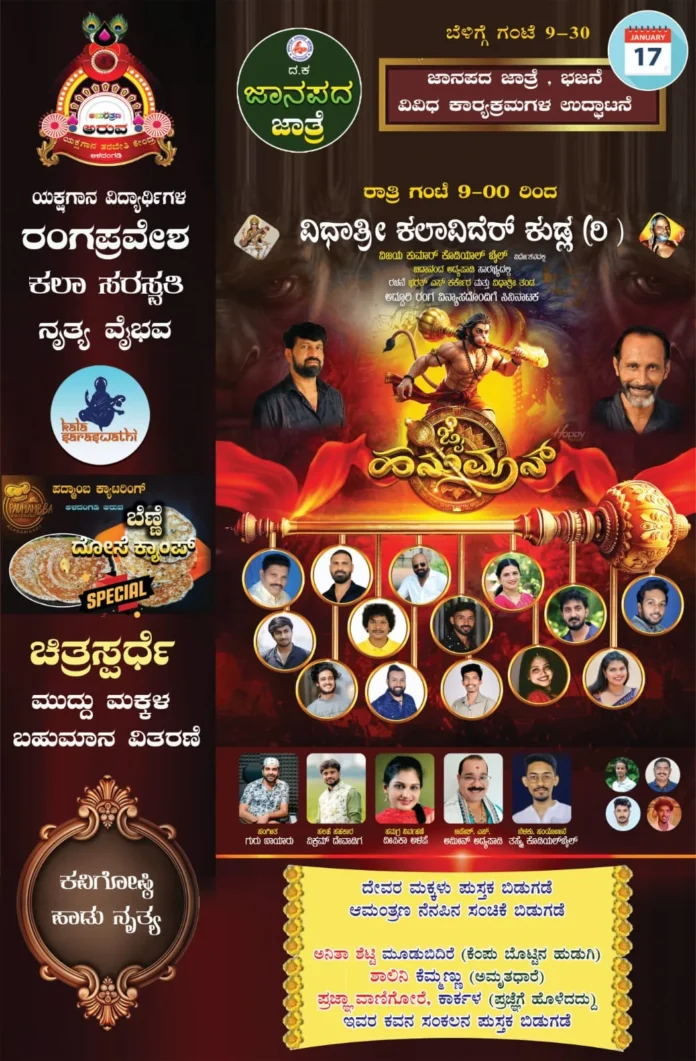 ಬೆಳಗಿನ ಕಾರ್ಯಕ್ರಮ: ಬೆಳಿಗ್ಗೆ 9:00 ಗಂಟೆಯಿಂದ ಜಾನಪದ ಜಾತ್ರೆ, ಭಜನೆ ಹಾಗೂ ವಿವಿಧ ಸಾಂಸ್ಕೃತಿಕ ಕಾರ್ಯಕ್ರಮಗಳ ಉದ್ಘಾಟನೆ ನಡೆಯಲಿದೆ. ಯಕ್ಷಗಾನ ರಂಗಪ್ರವೇಶ ಮತ್ತು ನೃತ್ಯ ವೈಭವ ಪ್ರಮುಖ ಆಕರ್ಷಣೆಯಾಗಿರಲಿವೆ.
