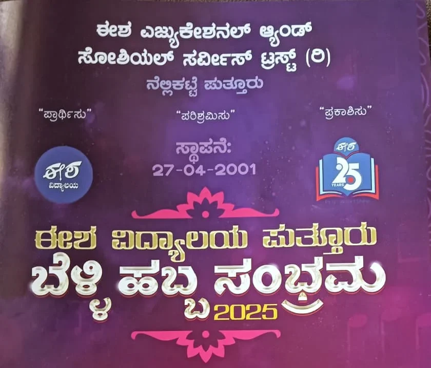 Uncategorizedಡಿ.28 ರಂದು ಈಶ ವಿದ್ಯಾಲಯ ಪುತ್ತೂರು ಬೆಳ್ಳಿ ಹಬ್ಬ ಸಂಭ್ರಮ 2025By TNVOffice - December 27, 2025028FacebookTwitterPinterestWhatsApp ಈಶ ಎಜ್ಯುಕೇಶನಲ್ ಆ್ಯಂಡ್ ಸೋಶಿಯಲ್ ಸರ್ವಿಸ್ ಟ್ರಸ್ಟ್ (ರಿ) ನೆಲ್ಲಿಕಟ್ಟೆ ಪುತ್ತೂರು .ದಿನಾಂಕ 28-12-2025 ನೇ ಭಾನುವಾರ ,ಬೆಳಗ್ಗೆ 9.00 ಗಂಟೆಗೆ “ಈಶ ವಿದ್ಯಾಲಯ ಪುತ್ತೂರು ಬೆಳ್ಳಿ ಹಬ್ಬ ಸಂಭ್ರಮ 2025” ಜೈನ ಭವನ ಪುತ್ತೂರು ವಿನಲ್ಲಿ ನಡೆಯಲಿದೆ.